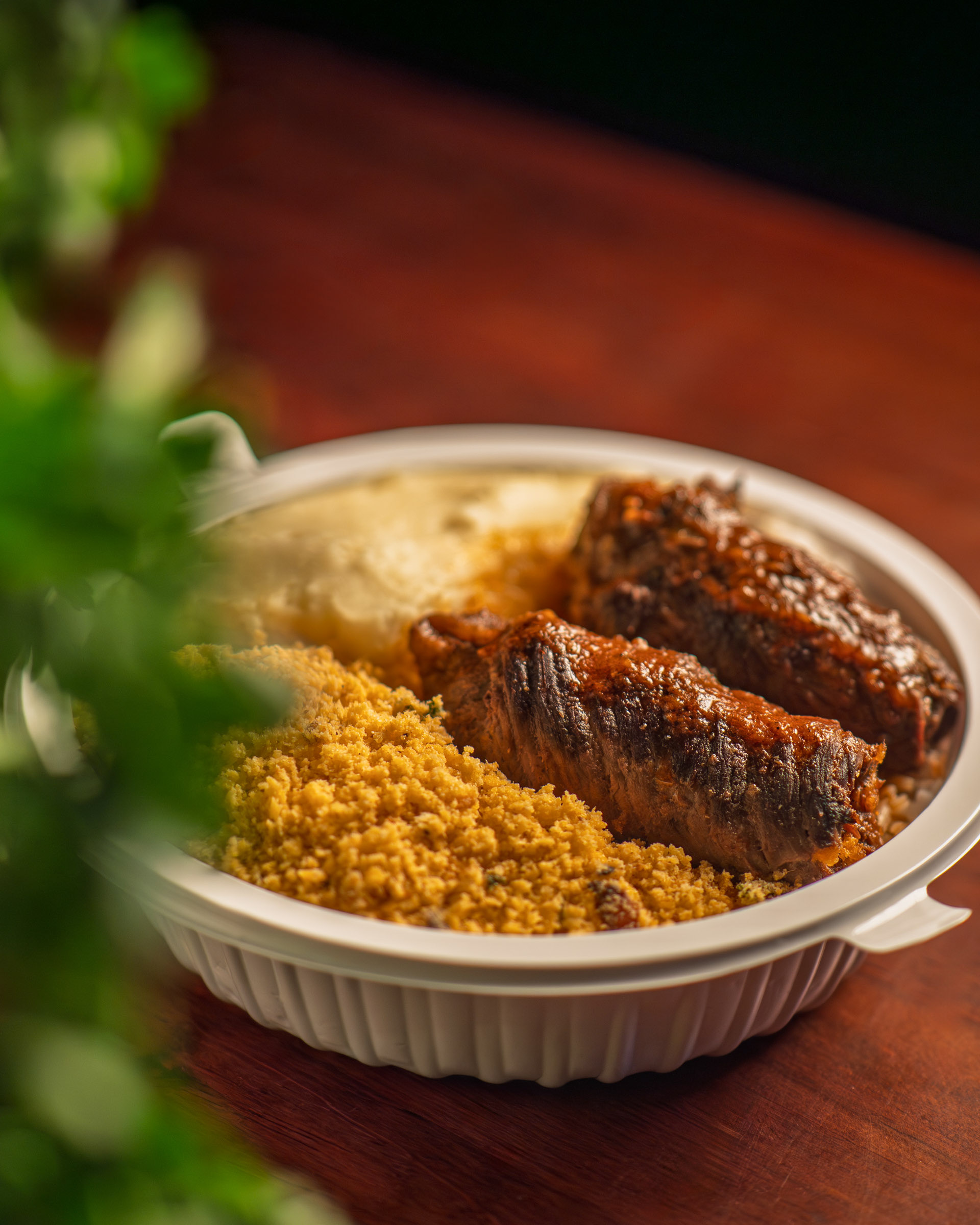 Um retrato de delivery que opera no eixo curioso entre precisão e sensibilidade. O desafio é usar a embalagem simples como um enquadramento que não distrai, mas que realça a presença da costelinha. O molho barbecue lustroso é o ponto focal: a iluminação concentrada e quente foi ajustada como quem afina uma lente, criando o High Gloss para traduzir a suculência e o calor vivo. É a coerência da imagem alinhada à filosofia de documentar a textura e a temperatura. A composição é intencionalmente centralizada para isolar o prato no fundo de madeira, garantindo que o impacto visual seja direto e sem superficialidade.