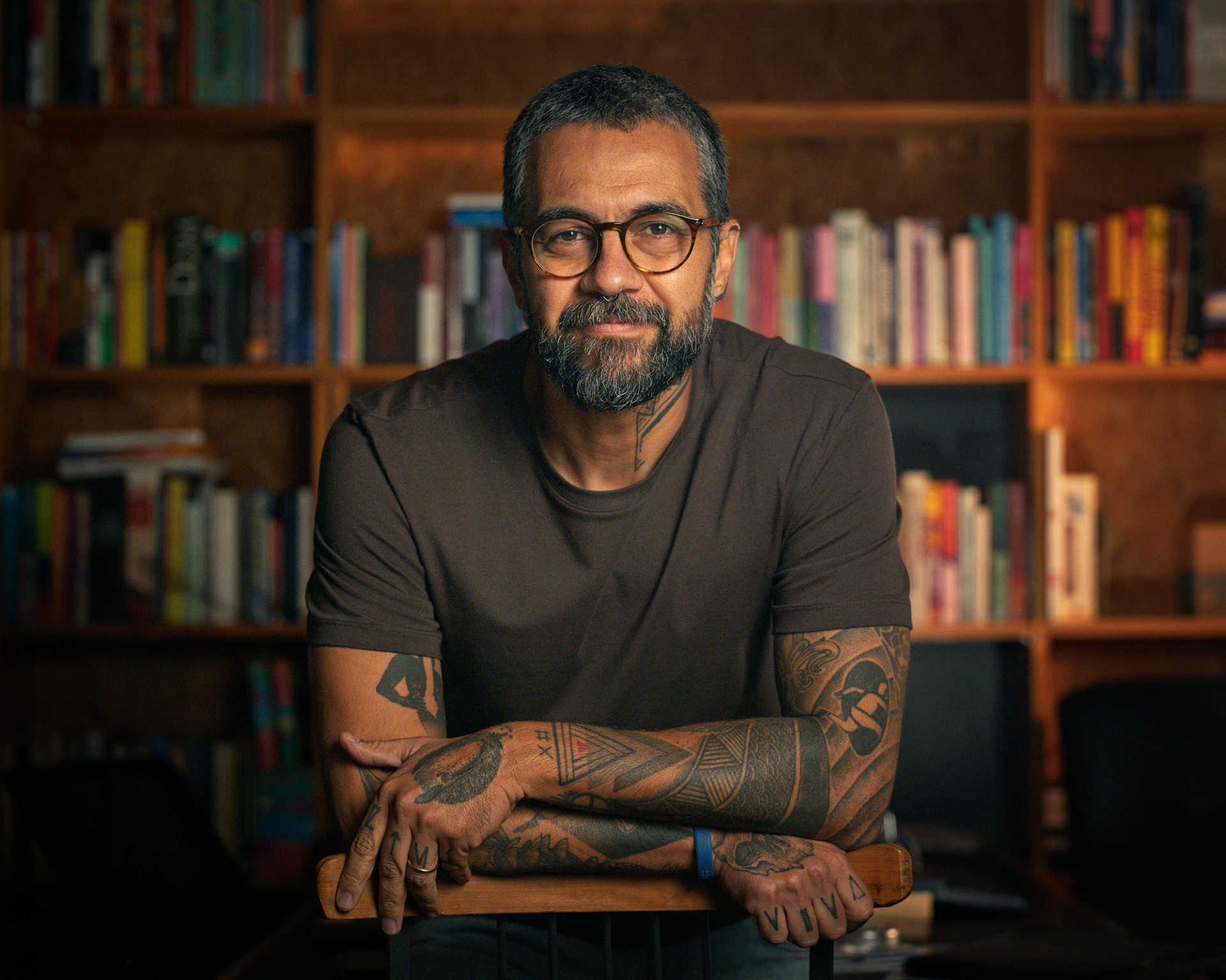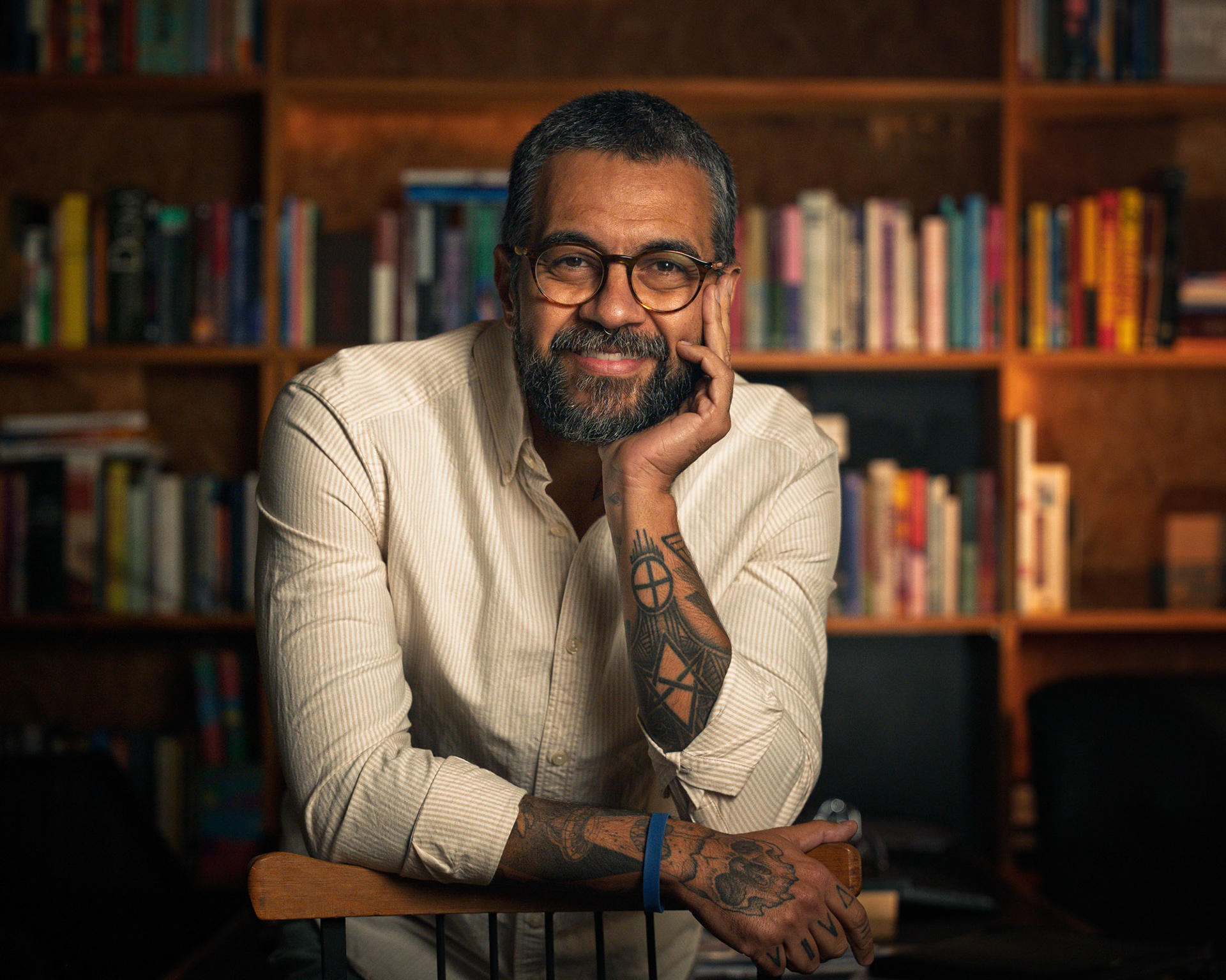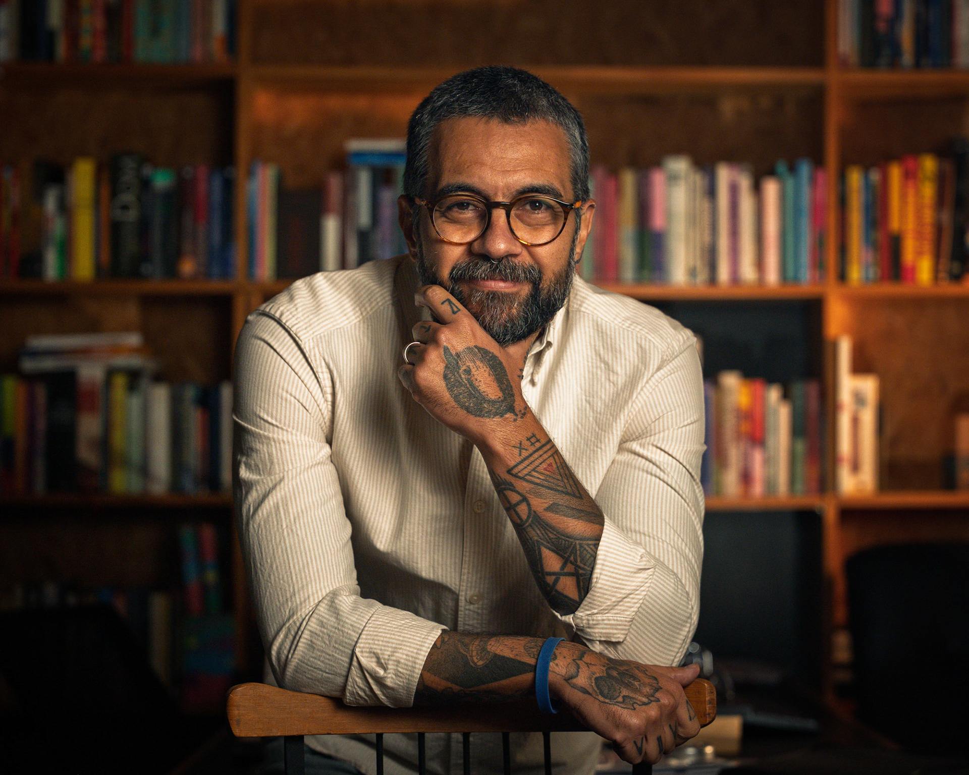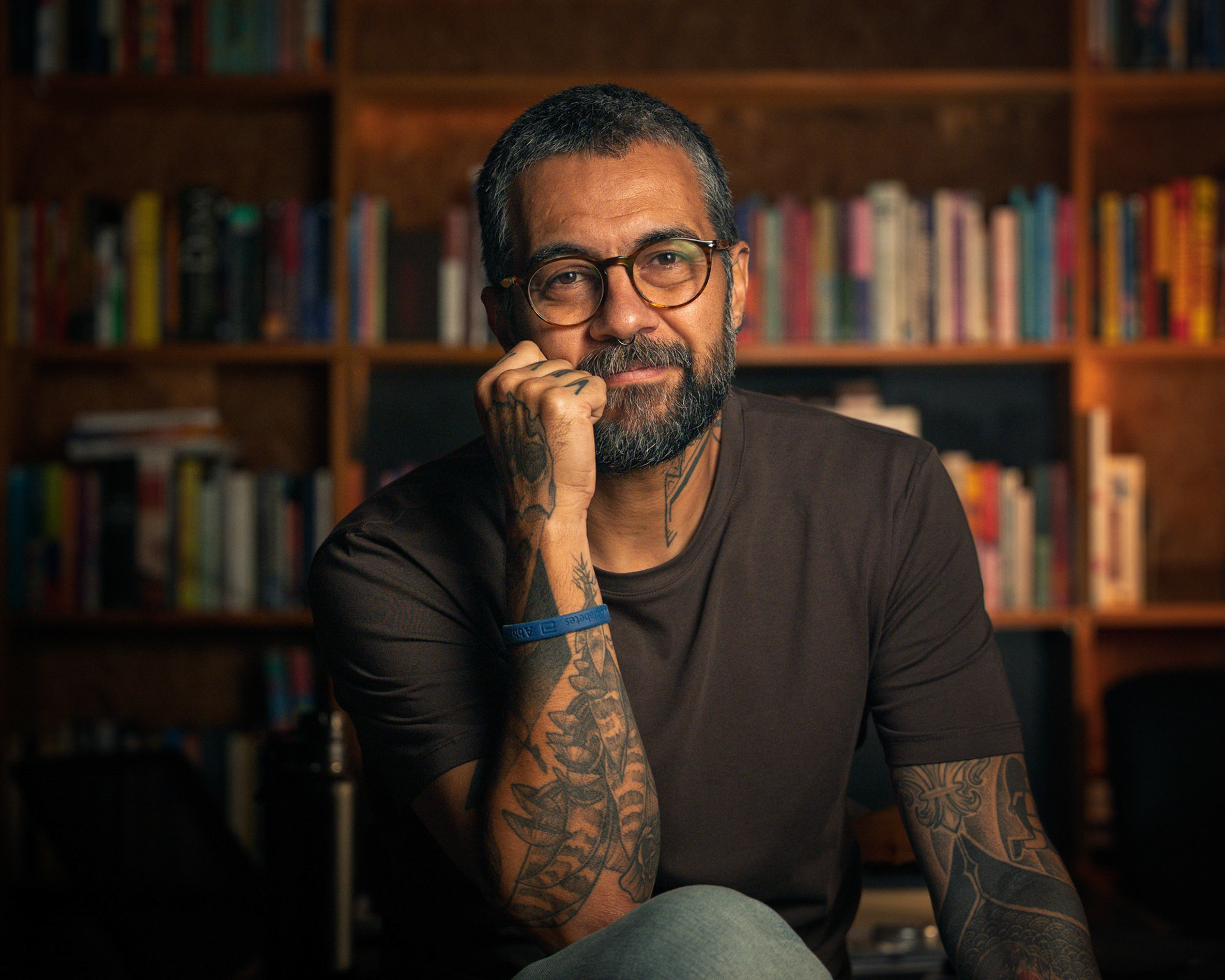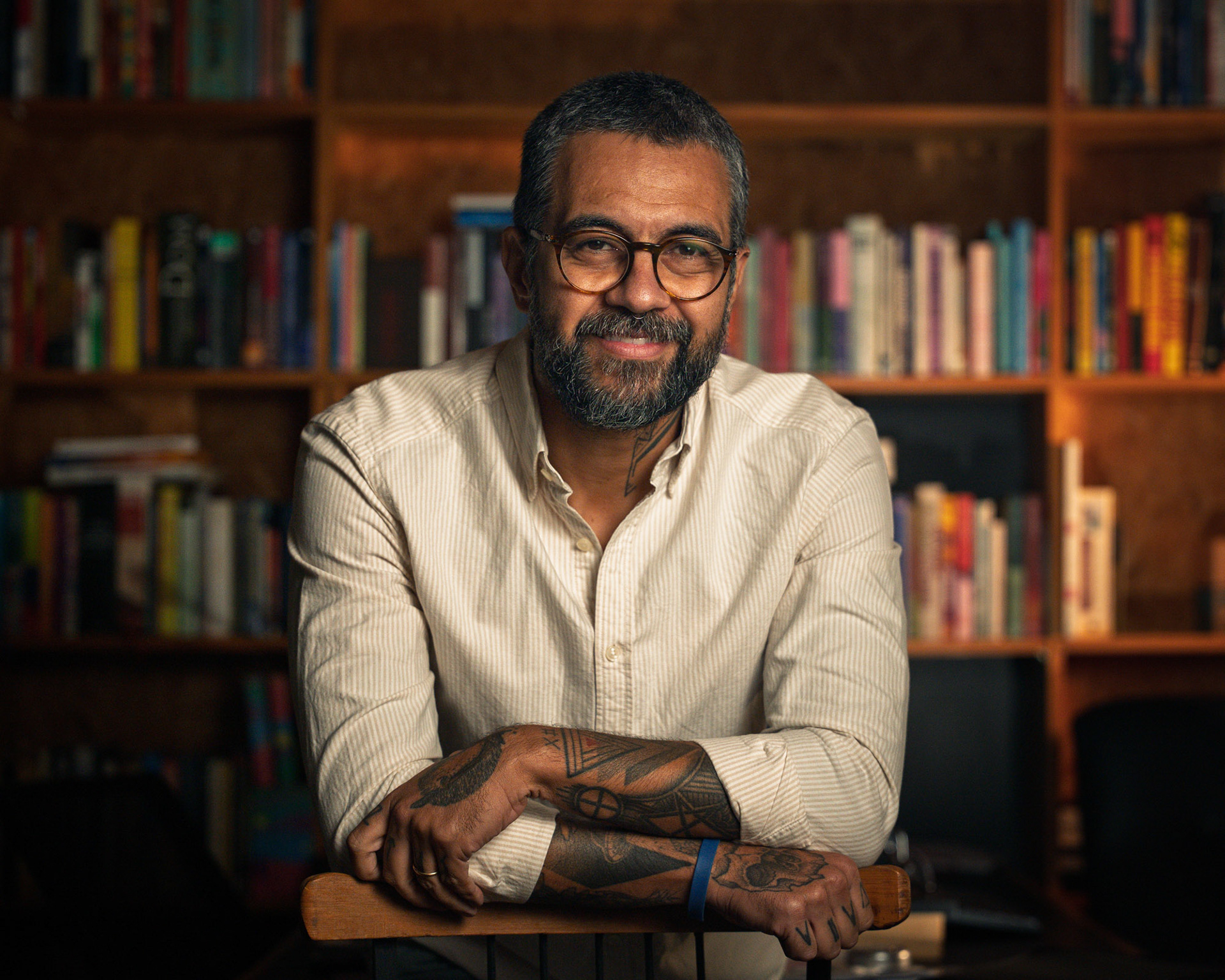 Este ensaio pessoal para Marcelo Souza exigiu a criação de um retrato que fosse além do corporativo tradicional, unindo autoridade intelectual com a autenticidade de sua personalidade. O desafio técnico foi montar um esquema de iluminação profissional dentro de um ambiente residencial, garantindo a qualidade de estúdio com o conforto do lifestyle. O registro foi construído com um controle intencional da luz artificial. Criei um esquema de iluminação que isolou o assunto, garantindo um highlight preciso no rosto e uma transição suave para o fundo. O cenário da biblioteca foi iluminado sutilmente para adicionar contexto, profundidade e calor (tons âmbar), quebrando o preto sem desviar o foco da expressão. A direção buscou poses que utilizassem o ambiente (a cadeira, as estantes) para transmitir confiança e acessibilidade. As fotos valorizam elementos de personalidade como as tatuagens e a expressão calma, transformando o retrato em uma declaração visual de quem ele é: um profissional com profundidade e estilo. Retrato Lifestyle que prova a capacidade de criar uma atmosfera controlada e intencional, onde o fundo não é apenas um cenário, mas um elemento narrativo que reforça a credibilidade e a identidade do indivíduo.