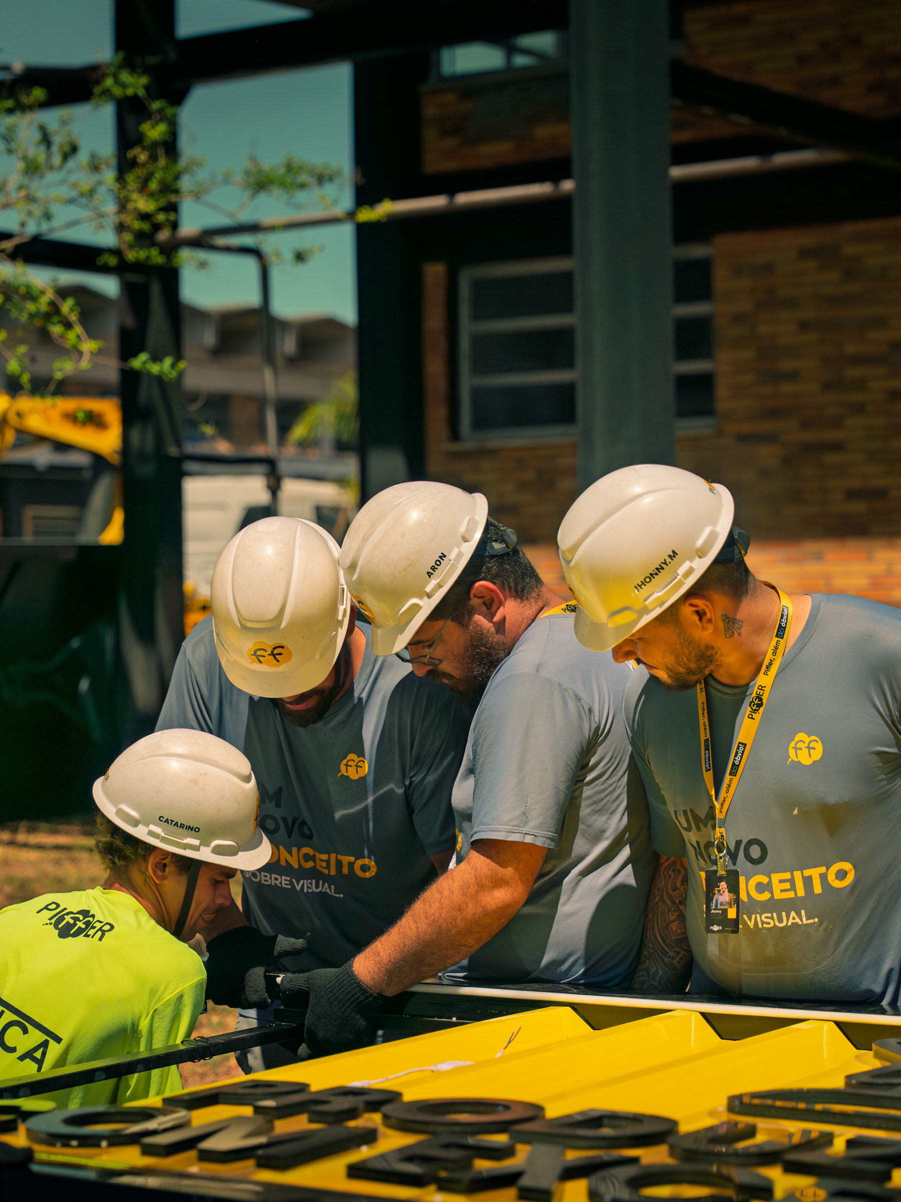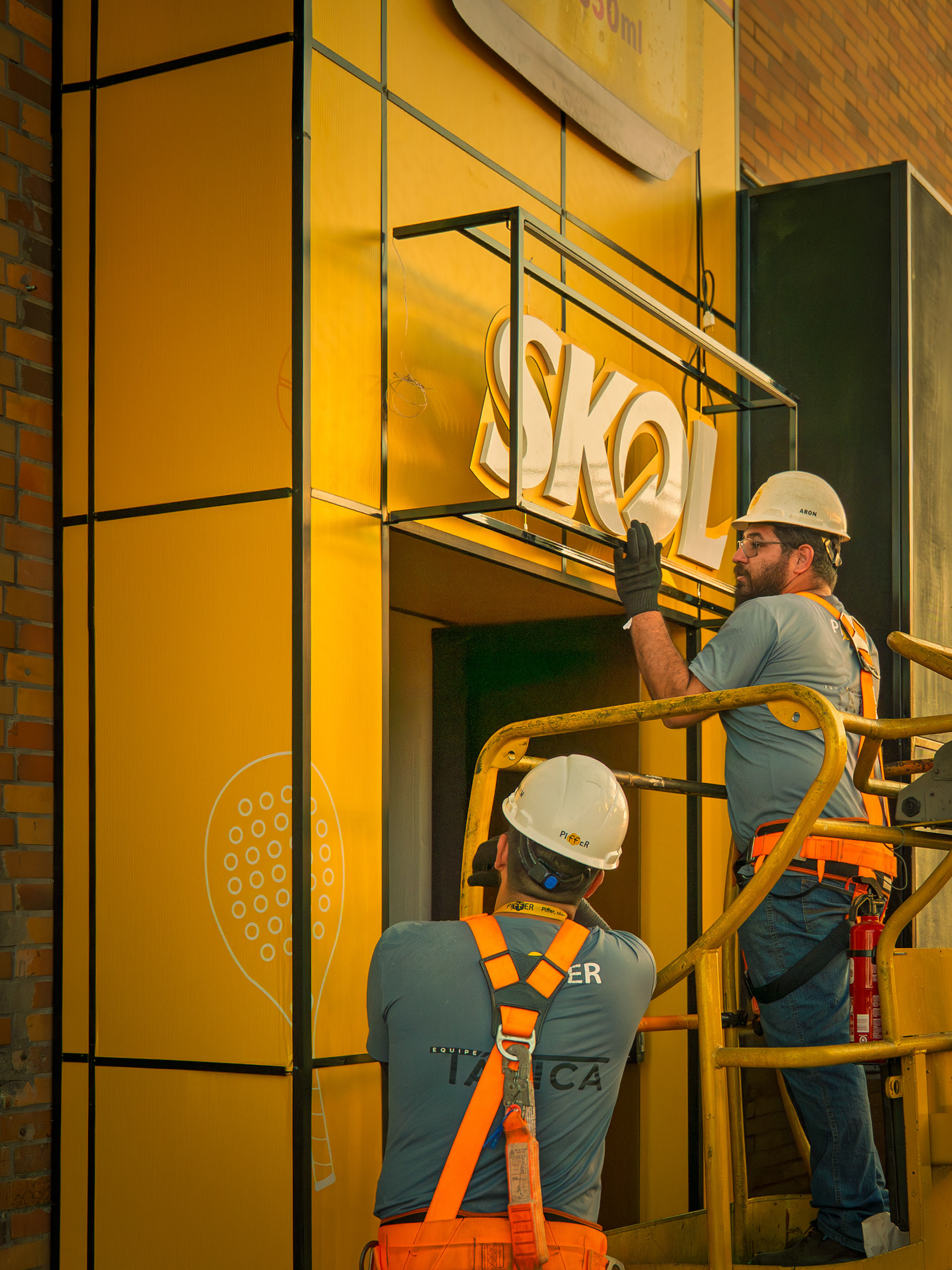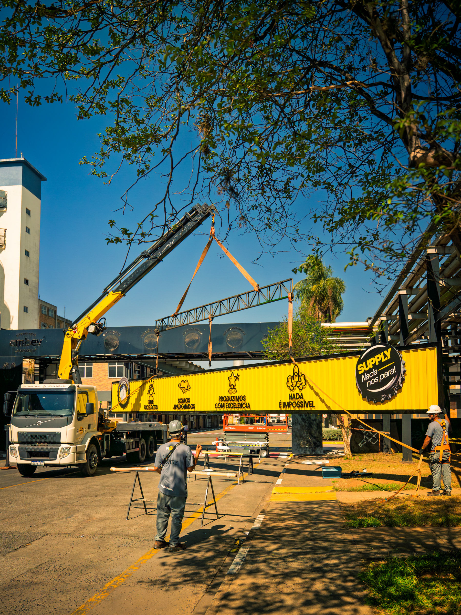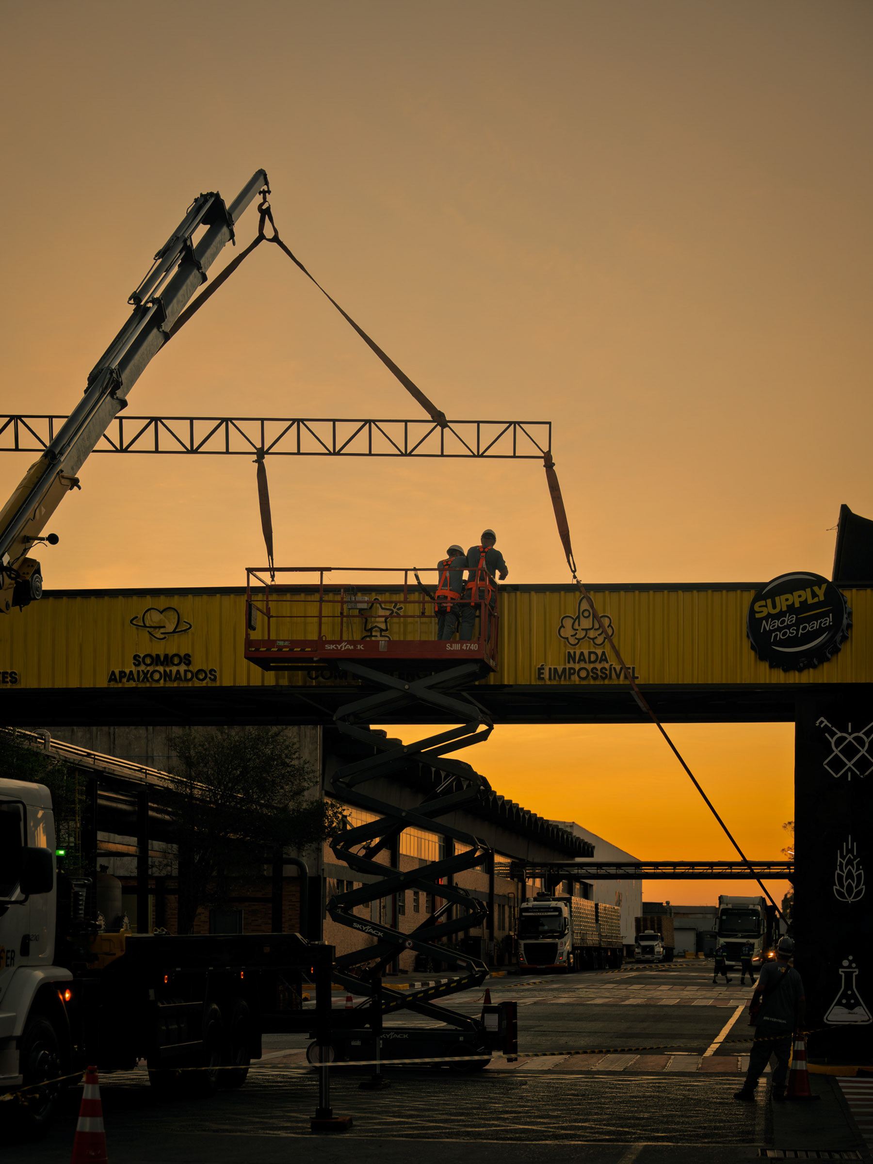 A instalação dos novos portais da Ambev exigiu uma fotografia de cobertura que documentasse não apenas a estrutura final, mas o rigor do processo operacional e a segurança da equipe Piffer em um ambiente industrial de alta exigência. O objetivo era traduzir em imagem a excelência na execução, o domínio da técnica e o profissionalismo do time. A cobertura focou em capturar o ritmo de trabalho e a escala industrial. As fotos utilizam close-ups nos colaboradores, devidamente equipados com EPIs, enfatizando a concentração, o trabalho em equipe e a seriedade da instalação. O uso estratégico da luz natural e dos ângulos altos (plataformas elevatórias) confere um visual robusto e autêntico à narrativa. Foi crucial registrar a manipulação das peças complexas (como as garrafas Stella Artois e Original em ACM e acrílico incolor com impressão invertida) durante o içamento e a fixação. As imagens mostram a aplicação do efeito flutuante com fita de LED nas bordas das garrafas, destacando o know-how da Piffer na união de materiais de alto padrão (ACM, acrílico, LED) em ambientes industriais. Cobertura Industrial que atesta a capacidade de execução da Piffer, demonstrando que a transformação de um portal em uma declaração de marca envolve planejamento, técnica, segurança e uma equipe especializada em lidar com desafios de infraestrutura complexa.