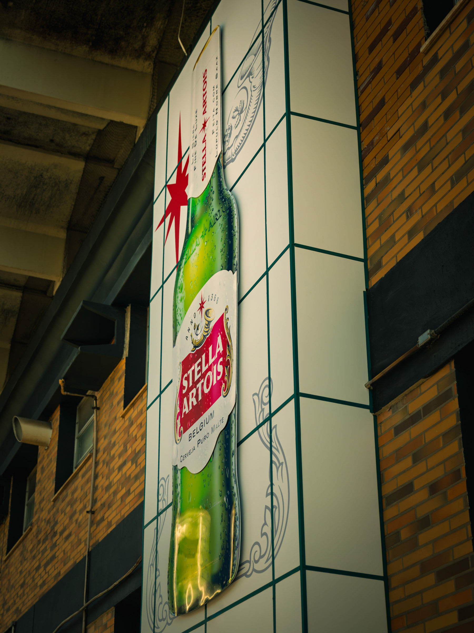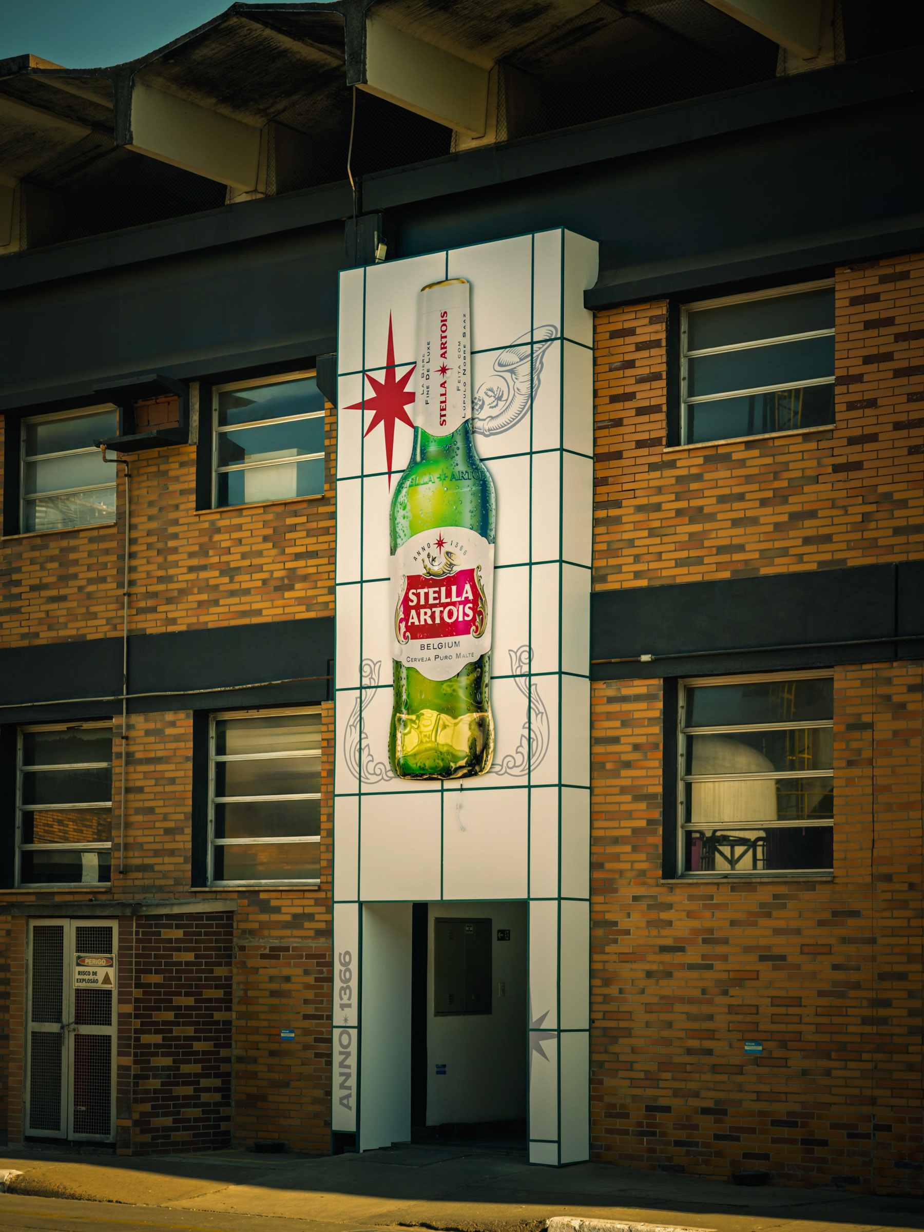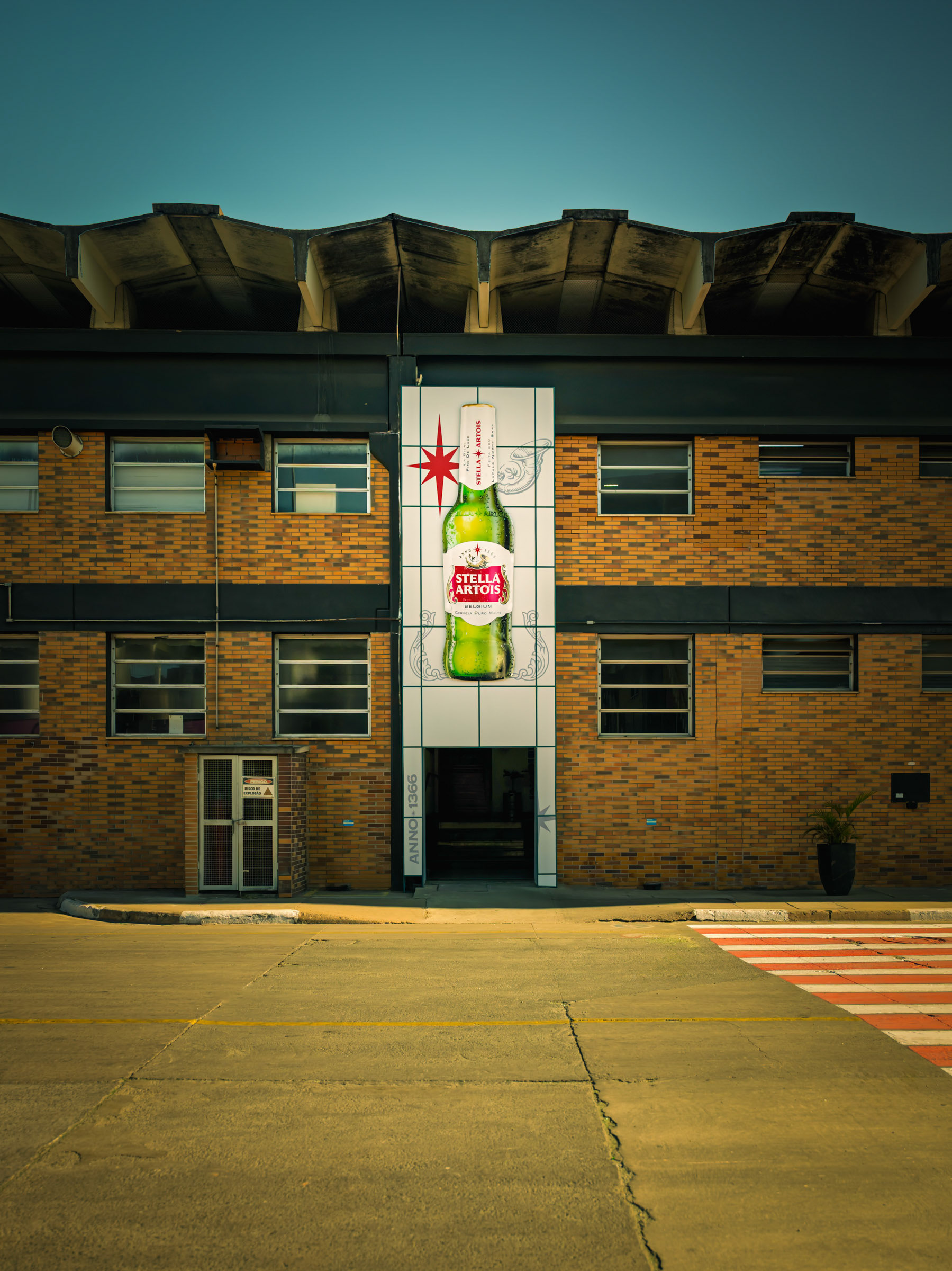 O projeto de revitalização dos portais da Ambev em Jaguariúna foi uma iniciativa complexa e de grande escala, visando transformar todas as entradas das diversas linhas de produção. Para cada linha, uma marca foi usada (Skol, Original, Stella Artois, Guaraná Antártica e Gatorade), convertendo acessos operacionais em declarações visuais de marca. A peça da Stella Artois, em destaque neste álbum, é o estudo de caso da padronização técnica e da engenharia de comunicação aplicada a todo o complexo industrial. O desafio da Piffer era replicar o brilho e a textura do vidro de uma garrafa em escala monumental sem utilizar o material, o que geraria peso excessivo e inviabilizaria a instalação. A Piffer solucionou isso com acrílico incolor e adesivação invertida no verso, técnica que simula o brilho vítreo e a profundidade do líquido com alta fidelidade. Meu foco principal foi traduzir essa materialidade técnica em imagem, valorizando o brilho e o efeito tridimensional. À noite, a fotografia enfrentou a intensa retroiluminação em LED verde (o halo de luz) como luz principal. Para equilibrar a exposição, aproveitei o refletor frontal existente no local como uma luz de preenchimento estratégico. Essa tática evitou que o backlight criasse subexposição no rótulo, controlando o brilho e garantindo a legibilidade perfeita e a riqueza da cor vermelha do branding Stella Artois. As imagens demonstram que o visual transcende o adesivo convencional, com a peça reagindo à luz com a autenticidade de uma garrafa gelada. O álbum prova a capacidade de registrar a engenharia da comunicação visual em grandes complexos industriais e a excelência técnica da solução.