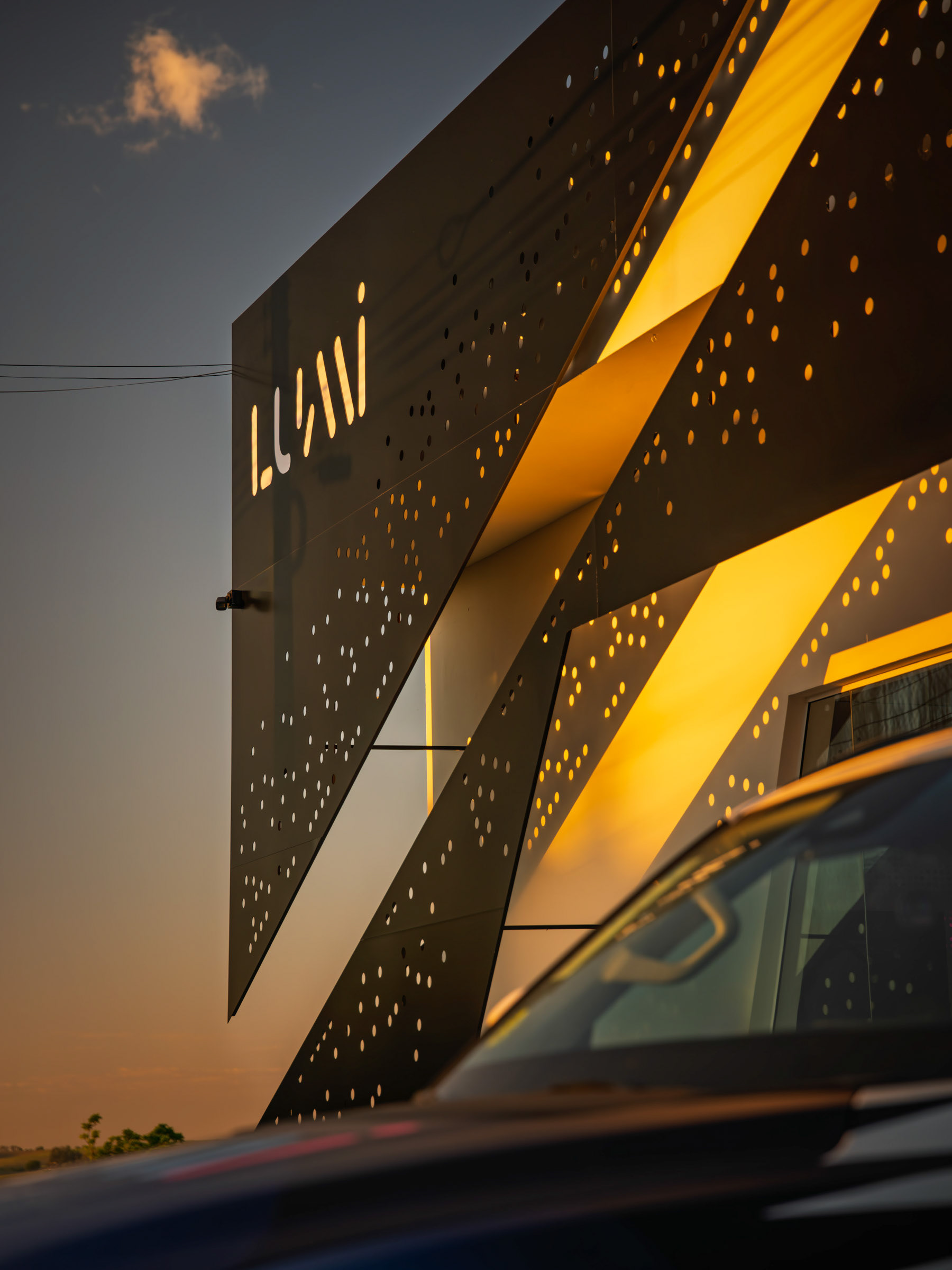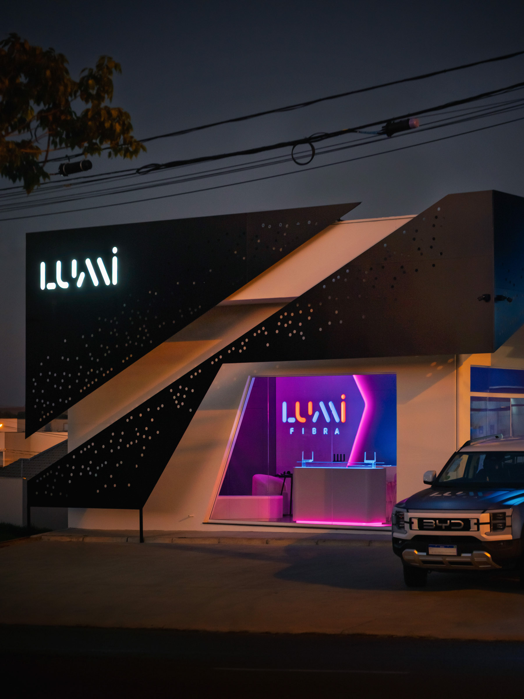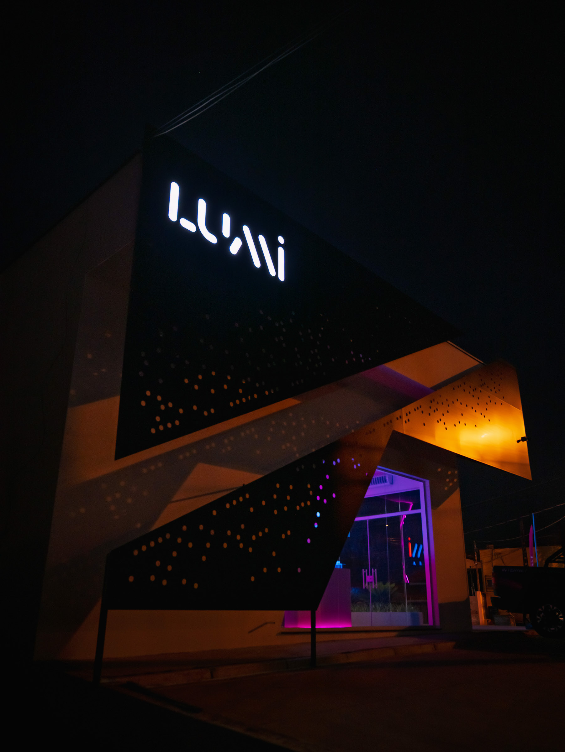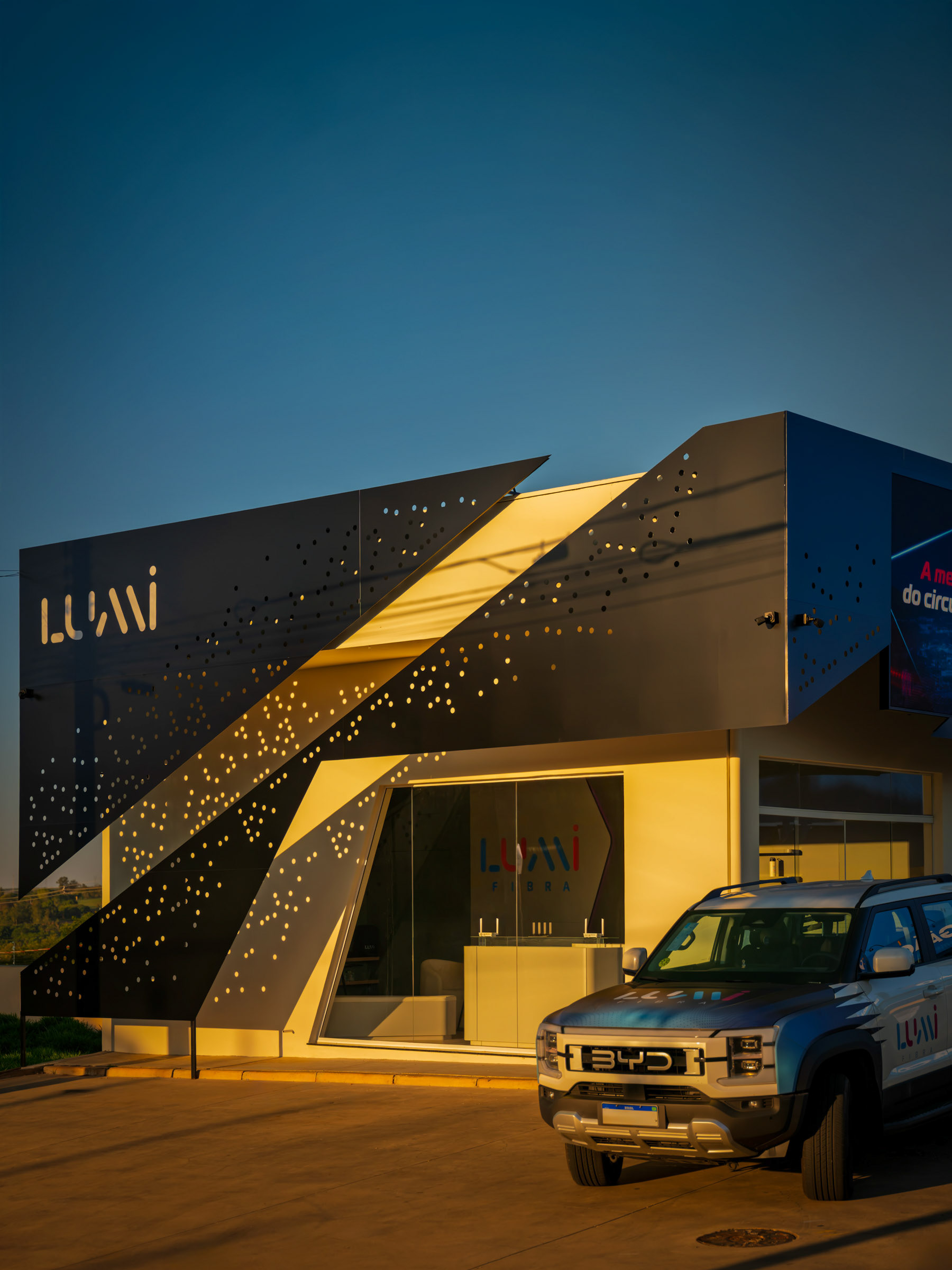 A Lumi nasceu para ser vista. O projeto do novo espaço em Jaguariúna uniu arquitetura autoral e soluções luminosas que pediam um olhar atento, capaz de traduzir design e tecnologia em imagem. O desafio estava em dar presença ao ACM perfurado, aos volumes em metalon e aos efeitos de iluminação que mudam completamente entre o dia e a noite. Trabalhei a fachada como um organismo vivo. O padrão de microperfurações cria uma textura que reage à luz e ganha movimento conforme o ângulo. À noite, o logo iluminado recortado no policarbonato se destaca em um backlight limpo, que pede um registro preciso para não perder o clima minimalista nem estourar o brilho. No interior, a sobreposição de chapas, o jogo de profundidade e o brilho contido nos acrílicos exigiram um controle fino de contraste. Busquei ângulos que valorizassem essa sensação de imersão, com especial atenção ao efeito flutuante criado pelo LED no contorno das peças. Cada foto tenta capturar o diálogo entre arquitetura, luz e ritmo, traduzindo o ambiente da Lumi como ele realmente se comporta. É um espaço pensado para impressionar e fotografado para revelar o que a olho nu nem sempre salta de primeira: textura, volume, atmosfera.