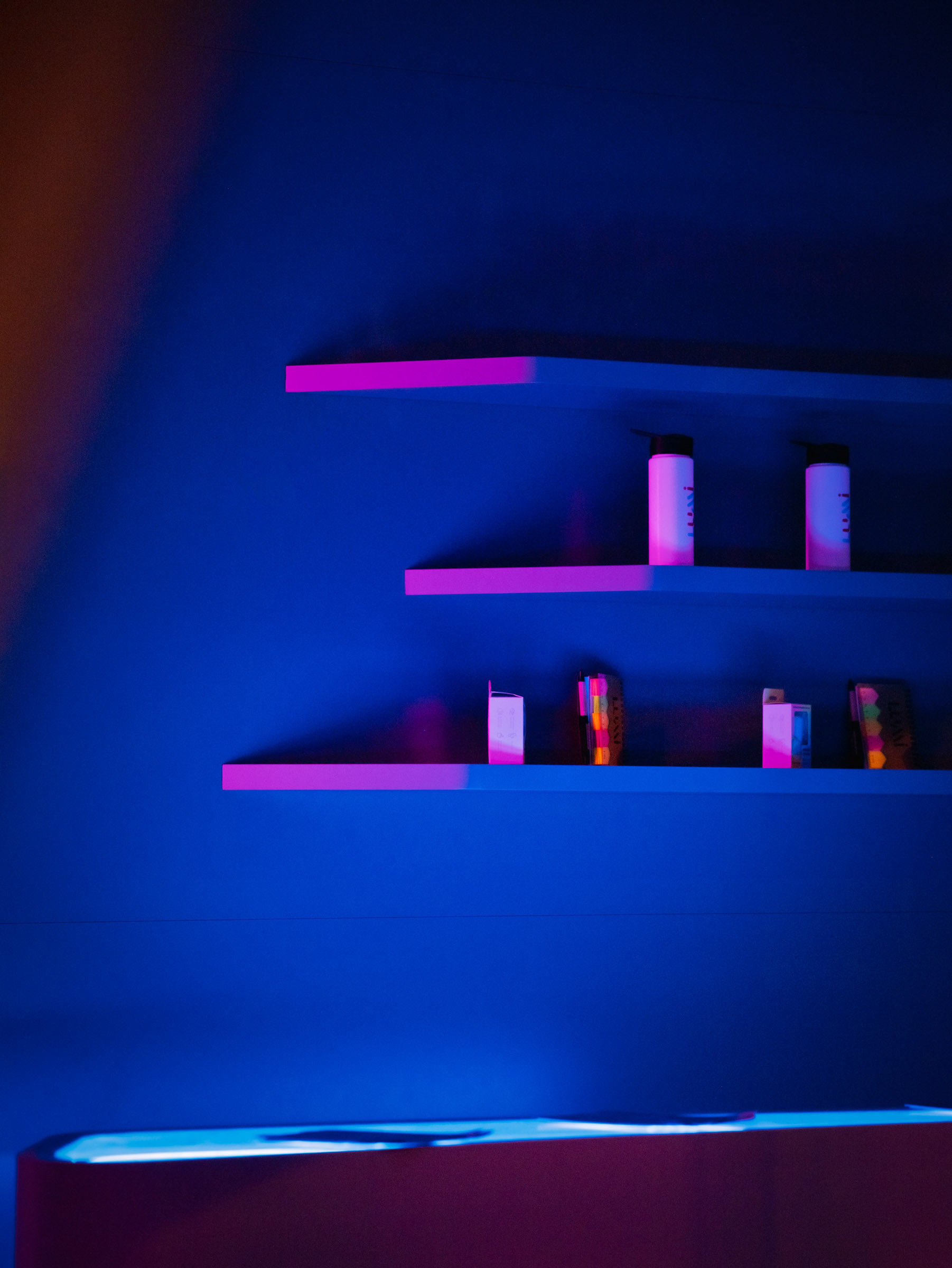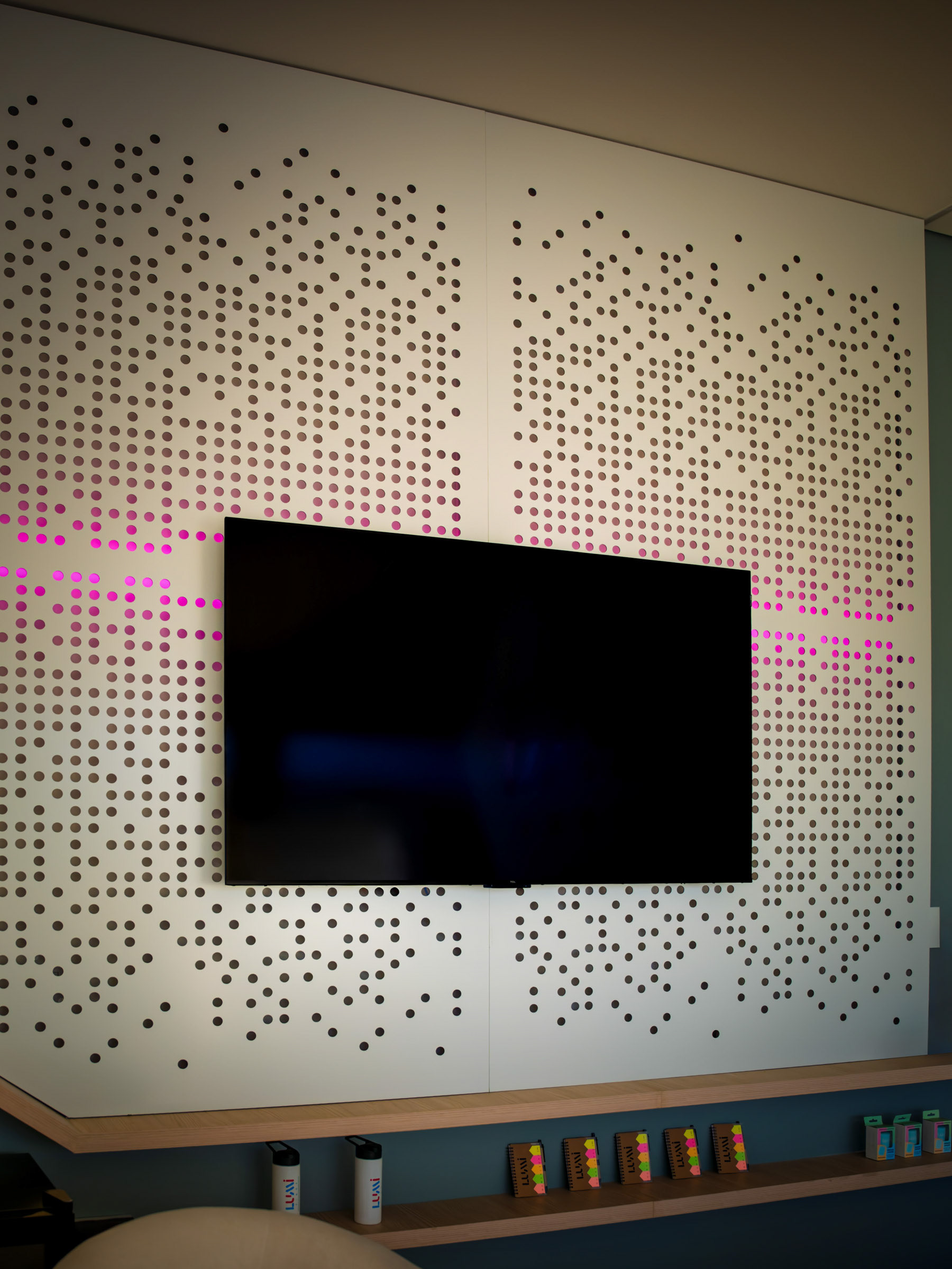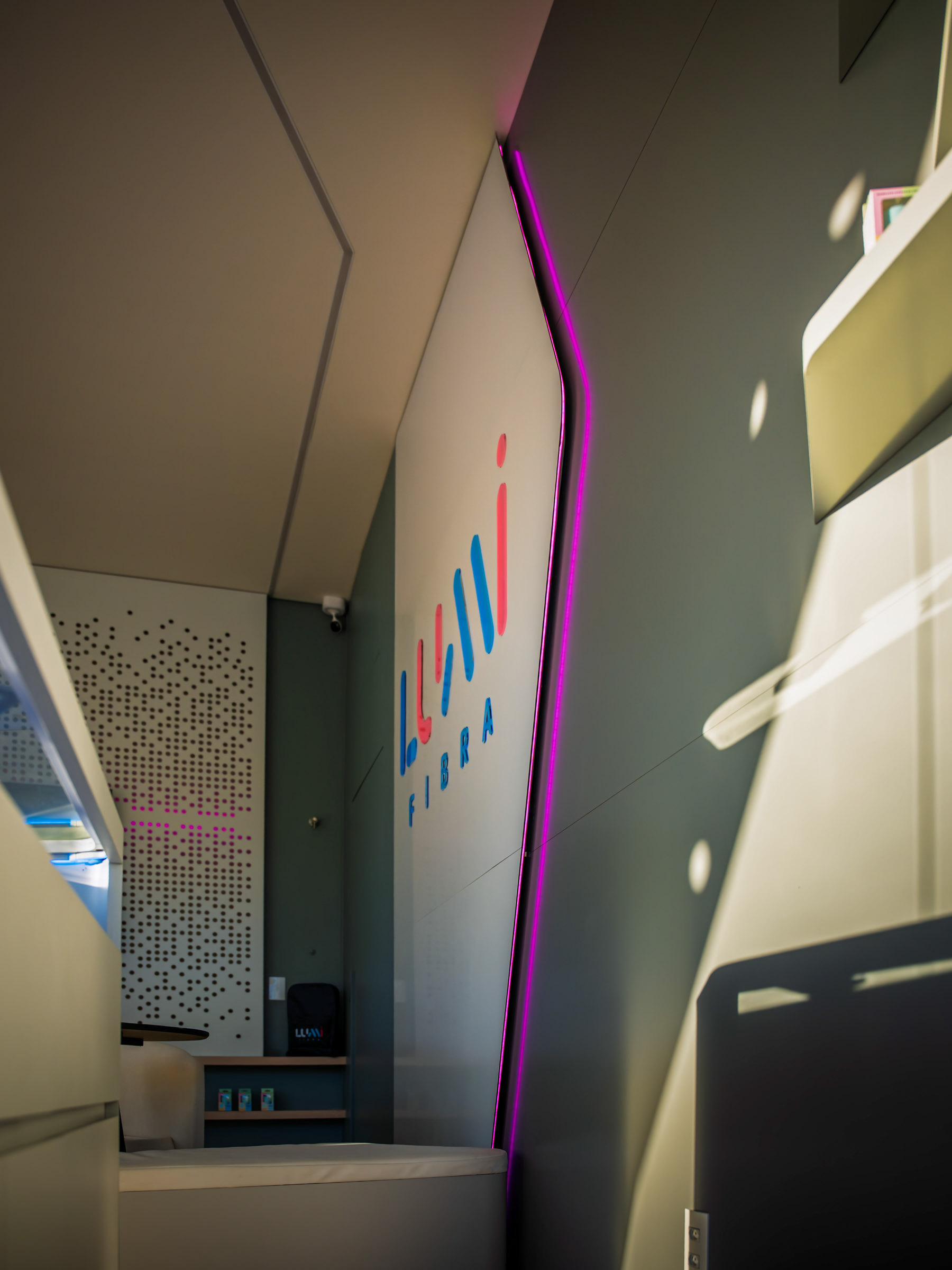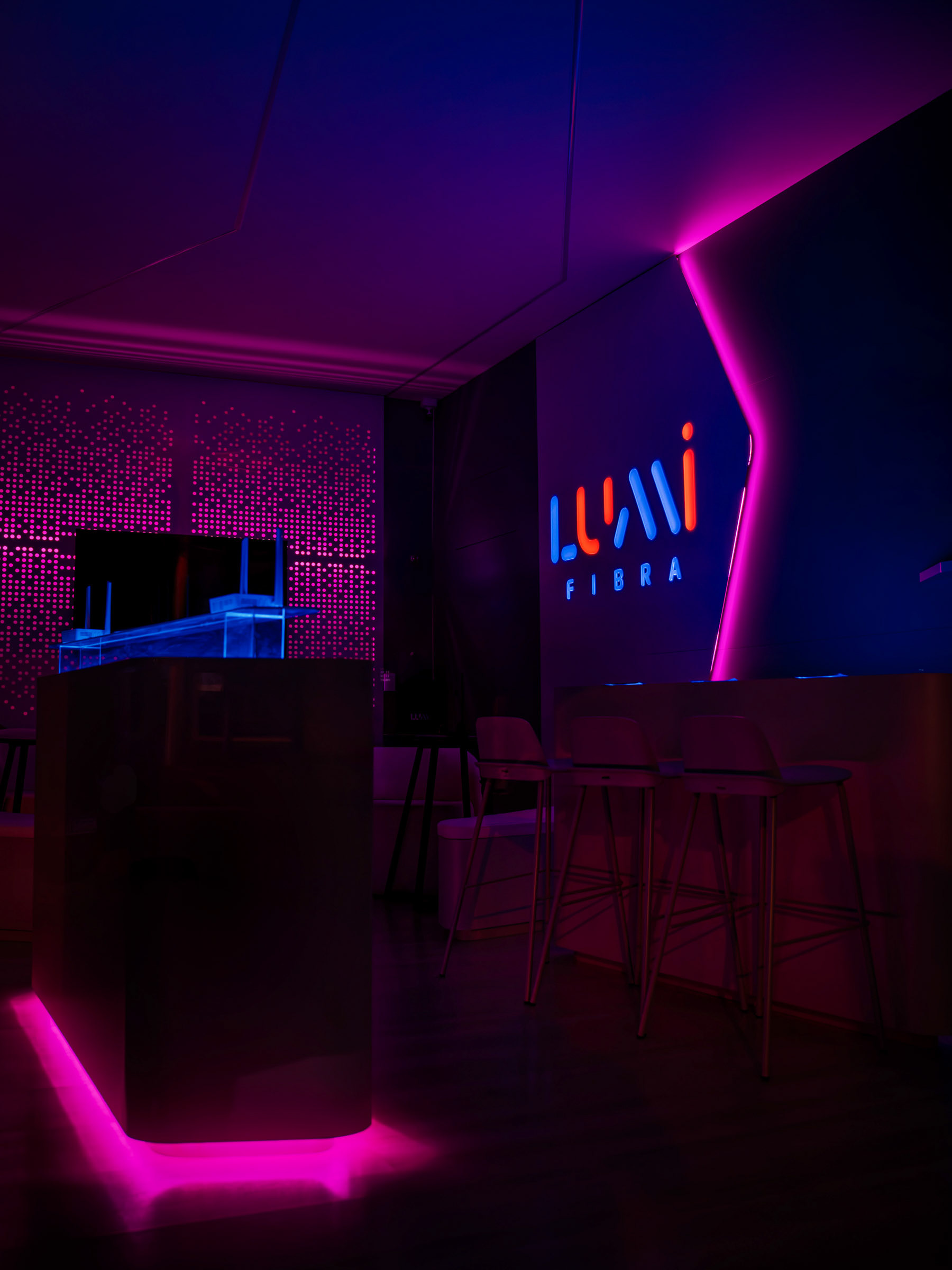 A Lumi nasceu para ser vista. O projeto do novo espaço em Jaguariúna uniu arquitetura autoral e soluções luminosas que pediam um olhar atento, capaz de traduzir design e tecnologia em imagem. O desafio estava em dar presença ao ACM perfurado, aos volumes em metalon e aos efeitos de iluminação que mudam completamente entre o dia e a noite. Trabalhei a fachada como um organismo vivo. O padrão de microperfurações cria uma textura que reage à luz e ganha movimento conforme o ângulo. À noite, o logo iluminado recortado no policarbonato se destaca em um backlight limpo, que pede um registro preciso para não perder o clima minimalista nem estourar o brilho. No interior, a sobreposição de chapas, o jogo de profundidade e o brilho contido nos acrílicos exigiram um controle fino de contraste. Busquei ângulos que valorizassem essa sensação de imersão, com especial atenção ao efeito flutuante criado pelo LED no contorno das peças. Cada foto tenta capturar o diálogo entre arquitetura, luz e ritmo, traduzindo o ambiente da Lumi como ele realmente se comporta. É um espaço pensado para impressionar e fotografado para revelar o que a olho nu nem sempre salta de primeira: textura, volume, atmosfera.