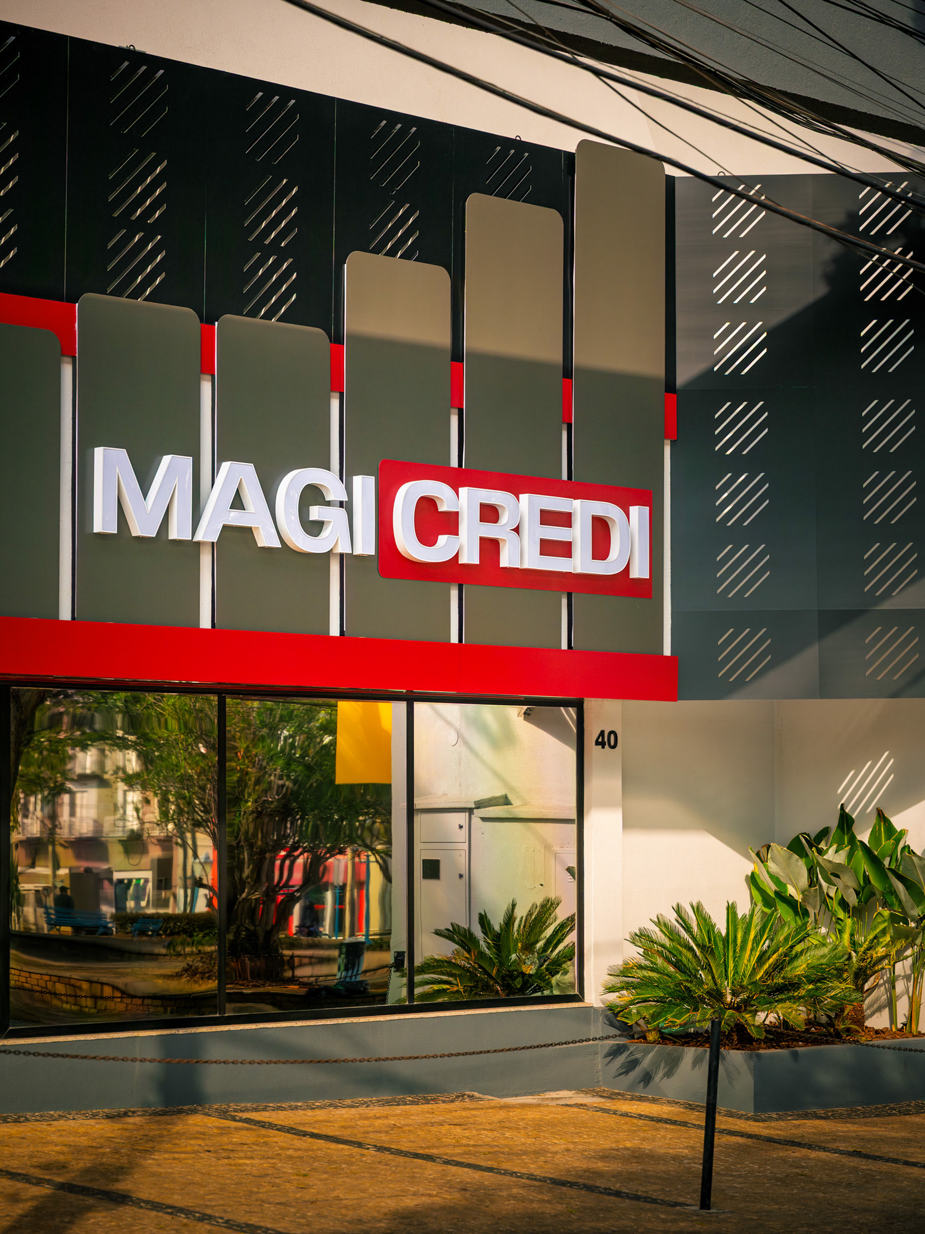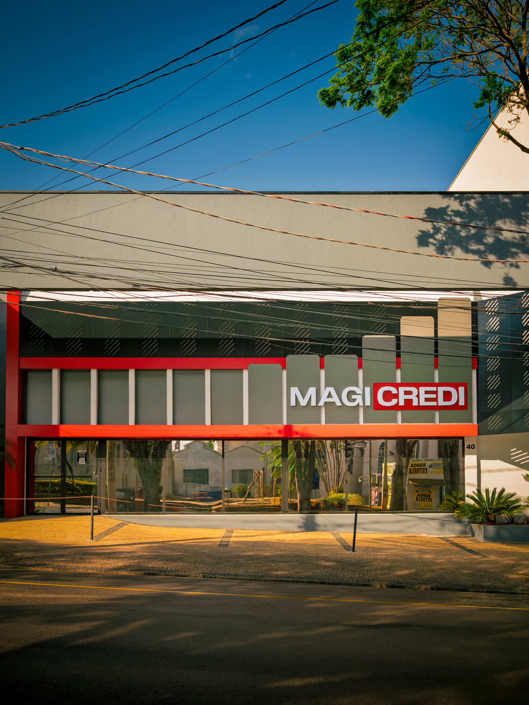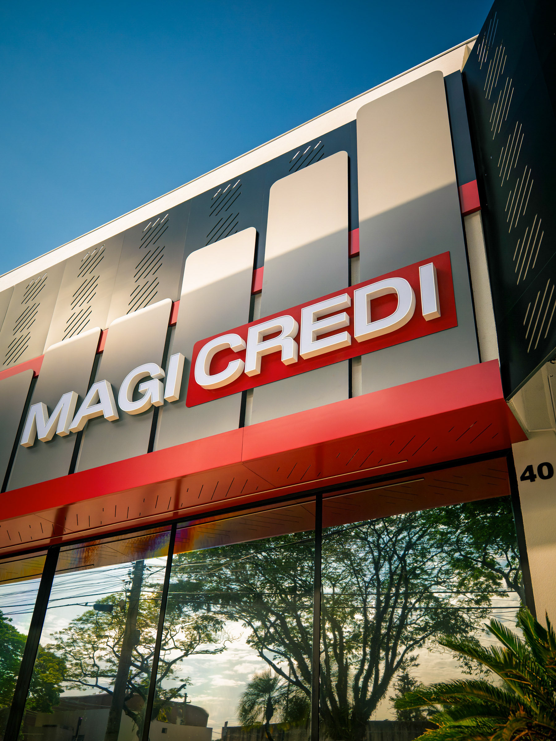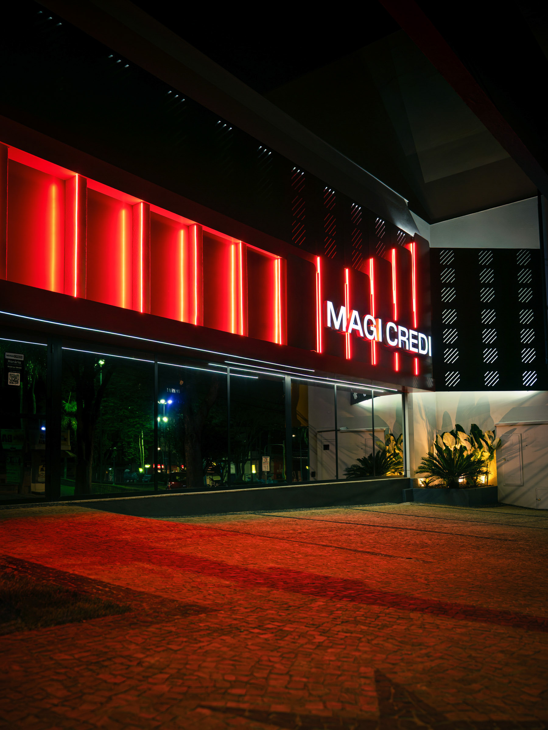 O projeto da Magicredi, desenvolvido pela Piffer, transformou o espaço em um ponto de contato que exala solidez e modernidade. Meu papel foi ir além do registro de fachada, buscando traduzir em imagem o conceito de crescimento, dinamismo e confiança que o design arquitetônico e o visual interno buscam comunicar. O projeto utilizou painéis em ACM com um padrão de recortes angulares que remetem a gráficos em ascensão. Na captura diurna, o desafio foi valorizar o brilho e a textura desses revestimentos sob a luz natural, controlando os reflexos da vitrine. À noite, as fitas de LED vermelhas embutidas criam um poderoso efeito backlight; utilizei exposições controladas para garantir que o LED brilhasse com personalidade, sem "estourar" o tom, enquanto o reflexo dramático no piso e na rua completava a cena com um impacto visual marcante. No interior, a fotografia focou em traduzir a organização, o profissionalismo e o acolhimento do ambiente. A consistência da marca é registrada nos painéis informativos de Visão e Valores, nos detalhes em madeira e nas repetições de elementos de design (como as cabines de atendimento). Foi crucial o controle de luz ambiente para destacar a legibilidade dos adesivos jateados e a textura do concreto aparente, assegurando que o vermelho vibrante da marca fosse transmitido com precisão. Cada imagem é uma tentativa de capturar o diálogo entre a precisão dos materiais e a identidade de marca, mostrando como o design de comunicação visual, quando bem executado e registrado, transcende o óbvio e reforça os valores da empresa em todos os seus pontos de contato.