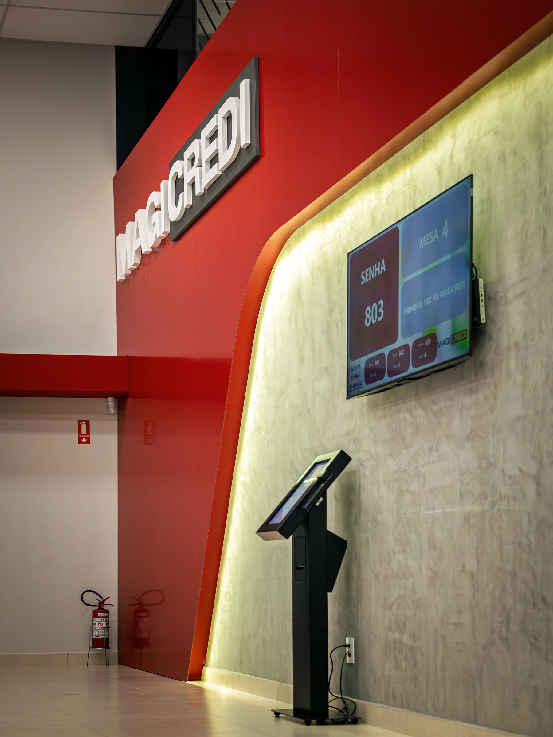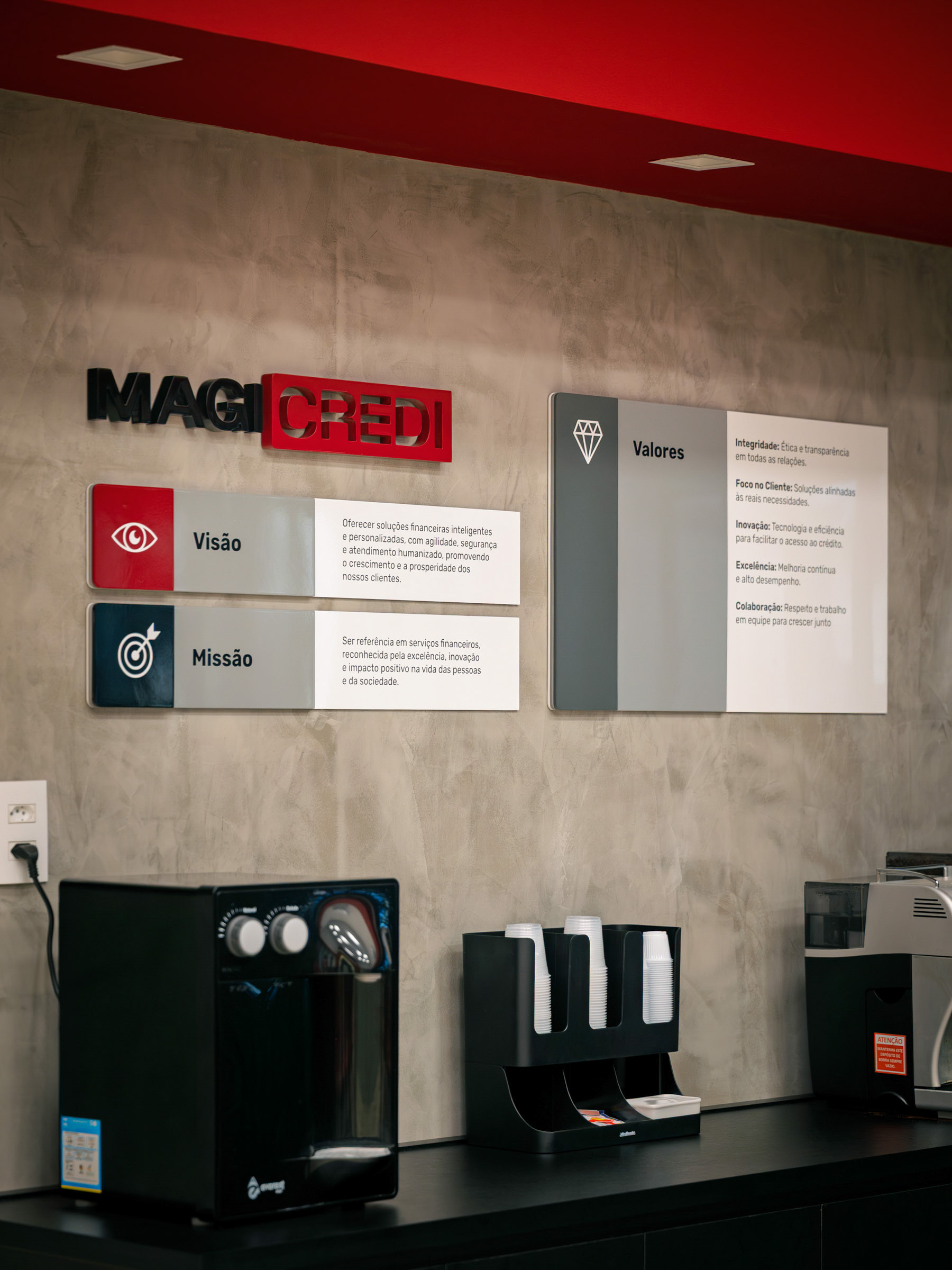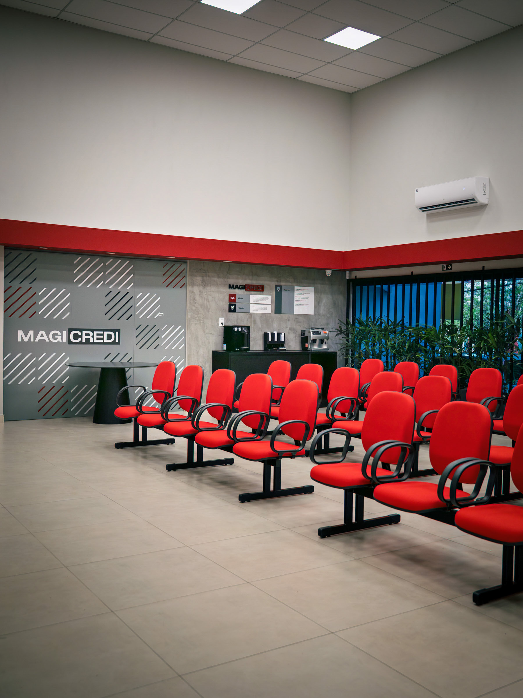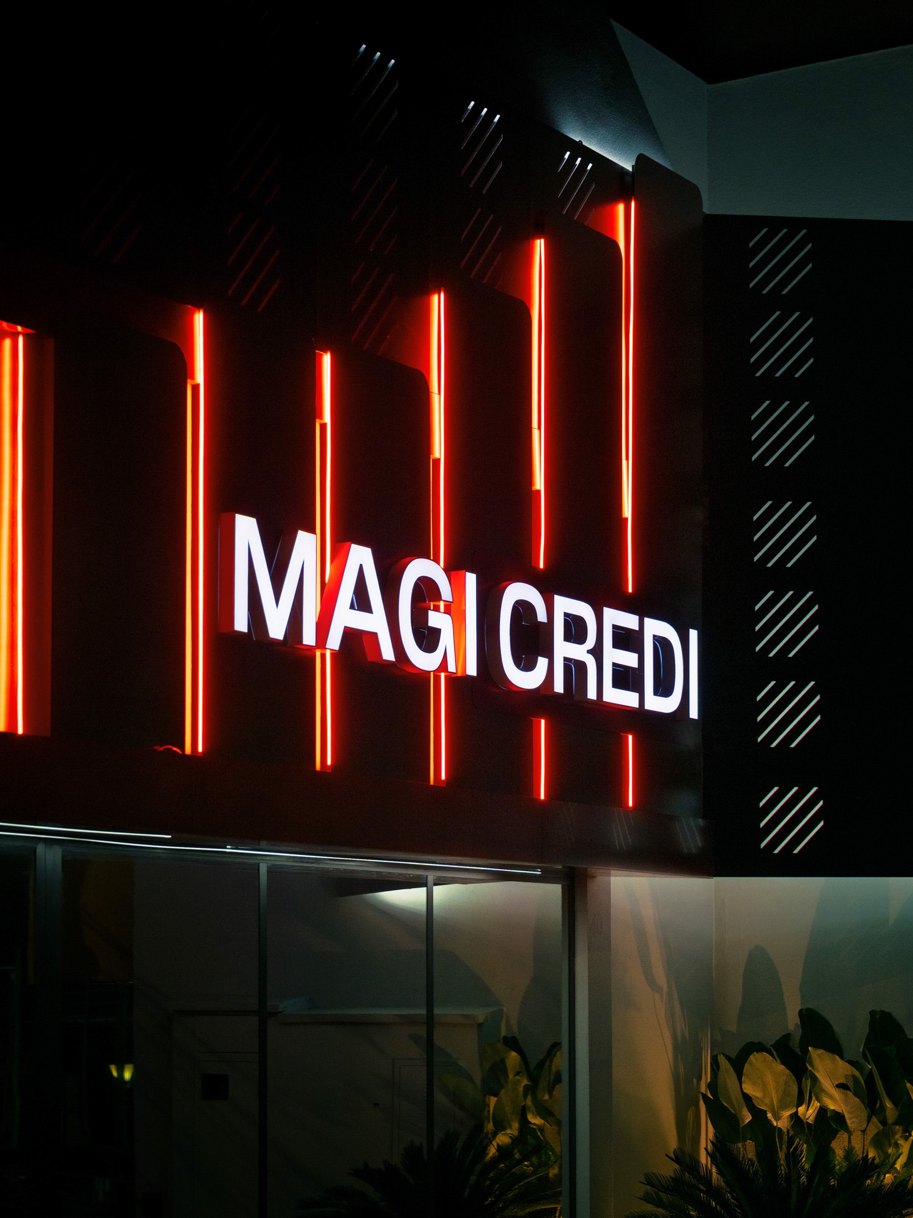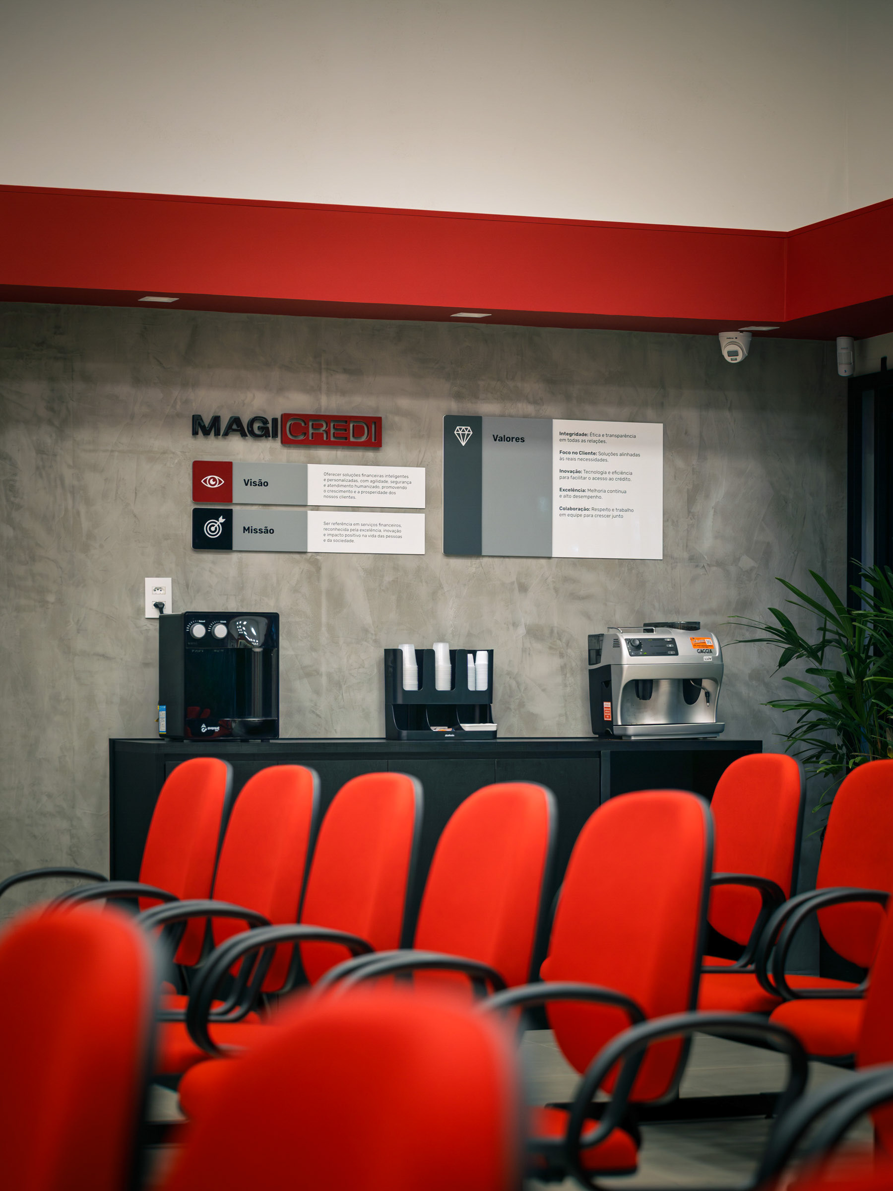 O projeto da Magicredi, desenvolvido pela Piffer, transformou o espaço em um ponto de contato que exala solidez e modernidade. Meu papel foi ir além do registro de fachada, buscando traduzir em imagem o conceito de crescimento, dinamismo e confiança que o design arquitetônico e o visual interno buscam comunicar. O projeto utilizou painéis em ACM com um padrão de recortes angulares que remetem a gráficos em ascensão. Na captura diurna, o desafio foi valorizar o brilho e a textura desses revestimentos sob a luz natural, controlando os reflexos da vitrine. À noite, as fitas de LED vermelhas embutidas criam um poderoso efeito backlight; utilizei exposições controladas para garantir que o LED brilhasse com personalidade, sem "estourar" o tom, enquanto o reflexo dramático no piso e na rua completava a cena com um impacto visual marcante. No interior, a fotografia focou em traduzir a organização, o profissionalismo e o acolhimento do ambiente. A consistência da marca é registrada nos painéis informativos de Visão e Valores, nos detalhes em madeira e nas repetições de elementos de design (como as cabines de atendimento). Foi crucial o controle de luz ambiente para destacar a legibilidade dos adesivos jateados e a textura do concreto aparente, assegurando que o vermelho vibrante da marca fosse transmitido com precisão. Cada imagem é uma tentativa de capturar o diálogo entre a precisão dos materiais e a identidade de marca, mostrando como o design de comunicação visual, quando bem executado e registrado, transcende o óbvio e reforça os valores da empresa em todos os seus pontos de contato.