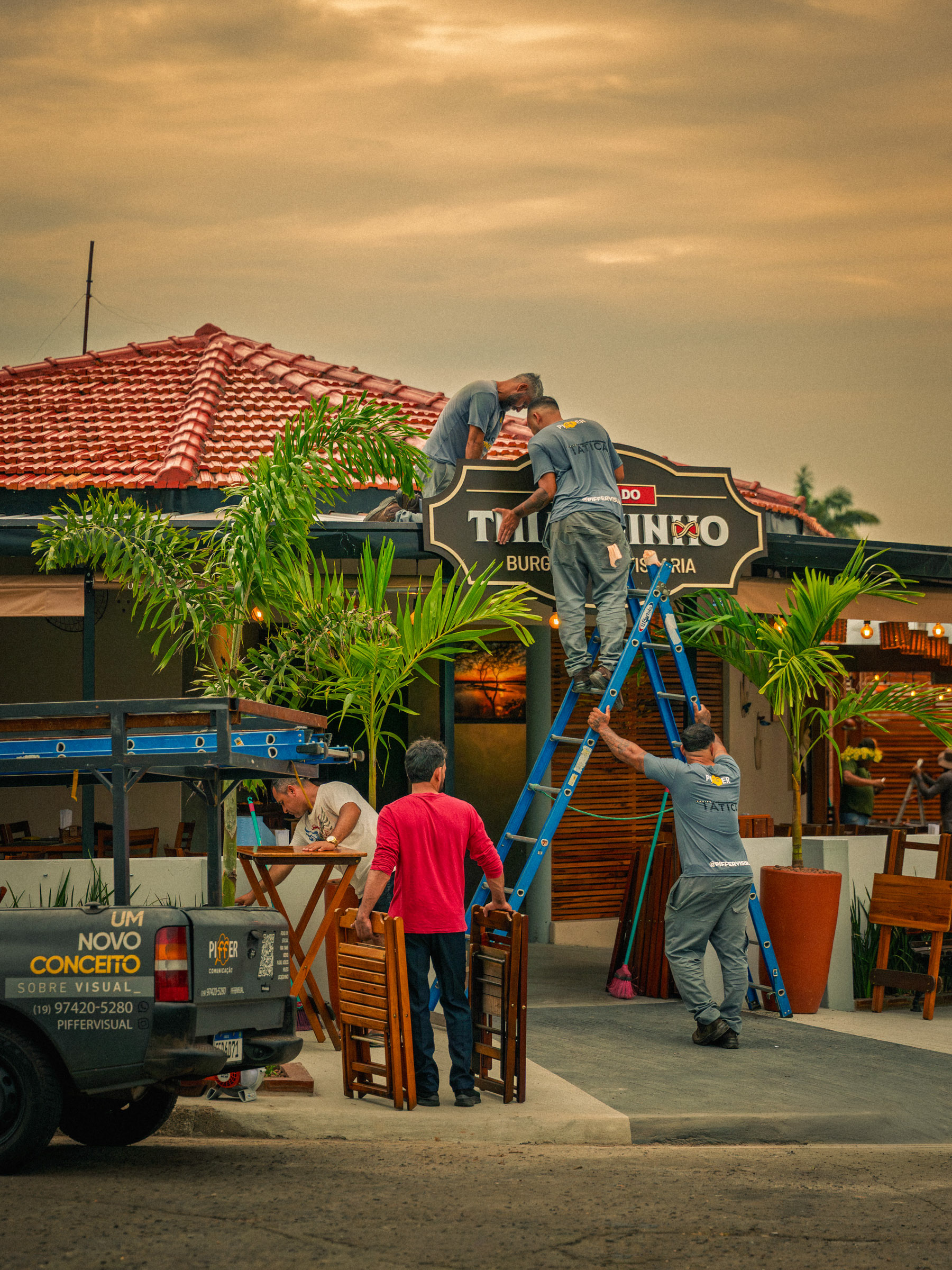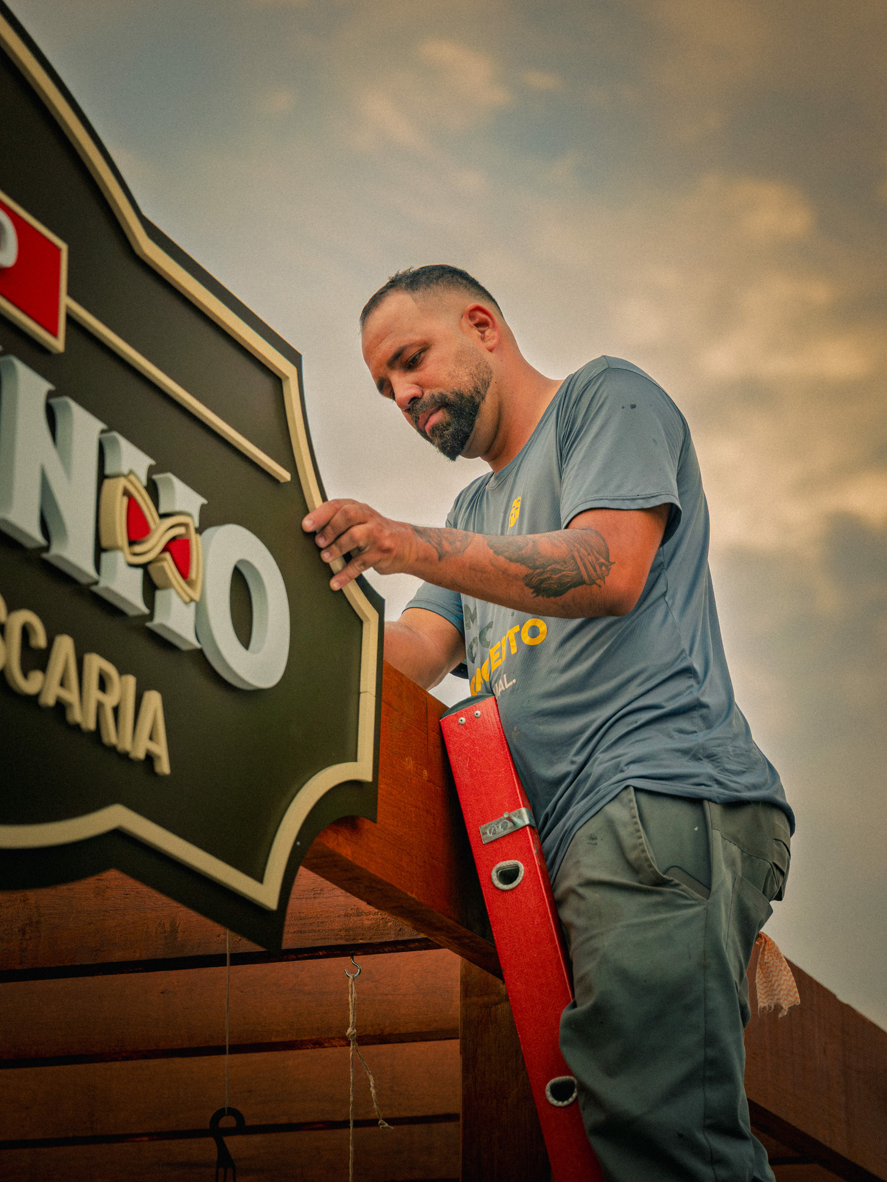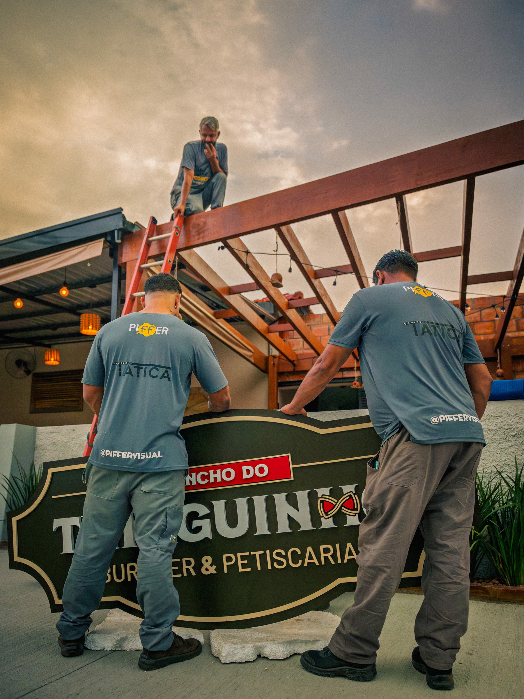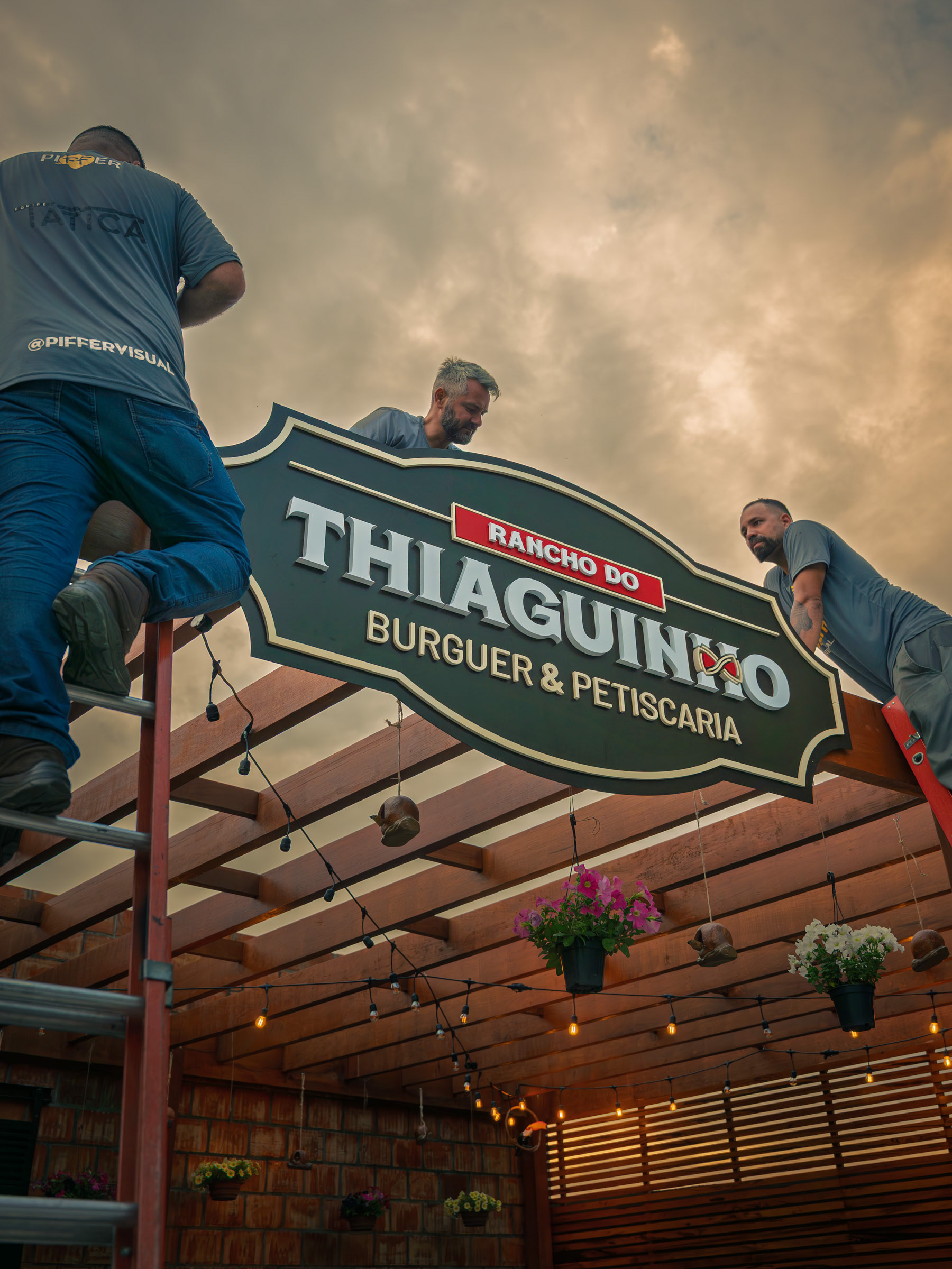 A instalação das novas placas do Rancho do Thiaguinho exigiu precisão técnica para garantir a firmeza da fixação e o alinhamento perfeito do design. Minha missão foi documentar o esforço e a técnica da equipe Piffer, transformando a instalação em uma prova visual de cuidado, foco e entrega. A fotografia capturou a instalação da placa (produzida em chapa de ACM/Metalon com letras em PVC expandido e pintura PU) em ângulos dinâmicos, utilizando as escadas como elemento gráfico. O uso da luz do golden hour realça as texturas da madeira e do tijolinho, criando uma atmosfera quente que contrasta com a seriedade da equipe Piffer. Este registro evidencia a concentração na fixação final com fita dupla face 3M, que assegura a durabilidade e o acabamento impecável. O álbum se aprofunda nos detalhes técnicos, registrando o momento em que a placa é elevada e fixada, garantindo que o design da marca se integrasse perfeitamente à arquitetura do pergolado. A atenção rigorosa ao alinhamento é a prova visual da expertise que a Piffer emprega para valorizar o visual de cada marca. As imagens criam um portfólio de cobertura operacional que reforça o compromisso da Piffer com a excelência técnica e a durabilidade, mesmo sob a pressão da instalação final.