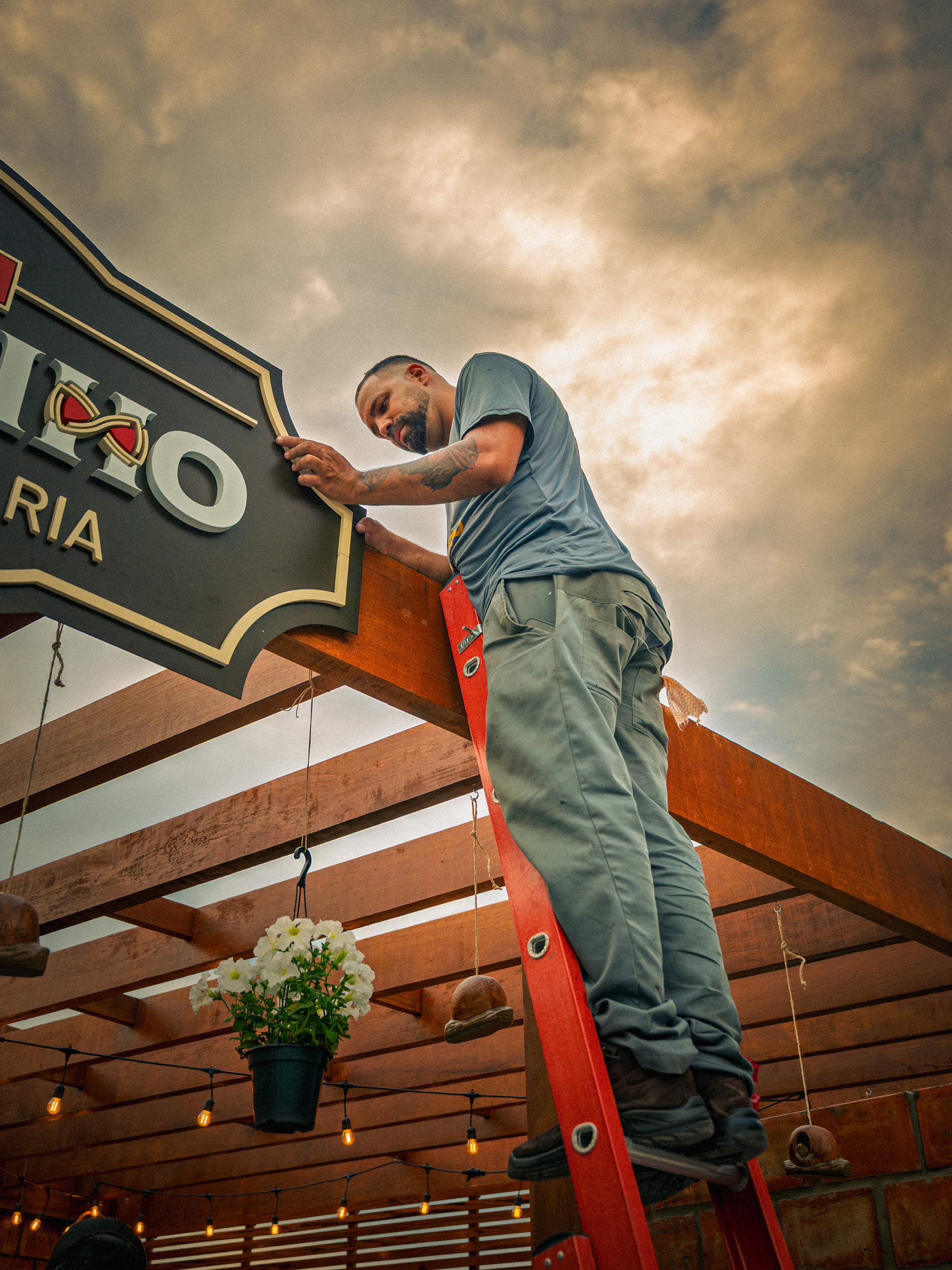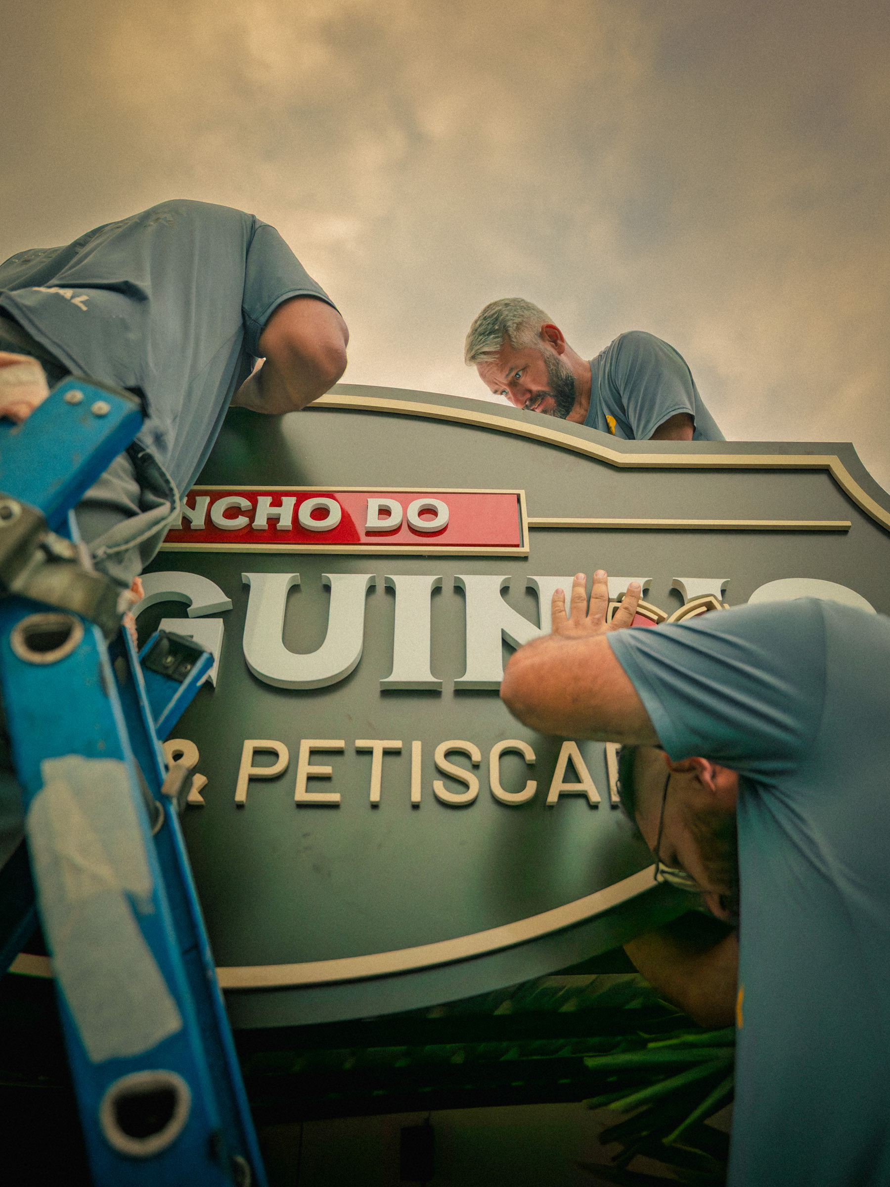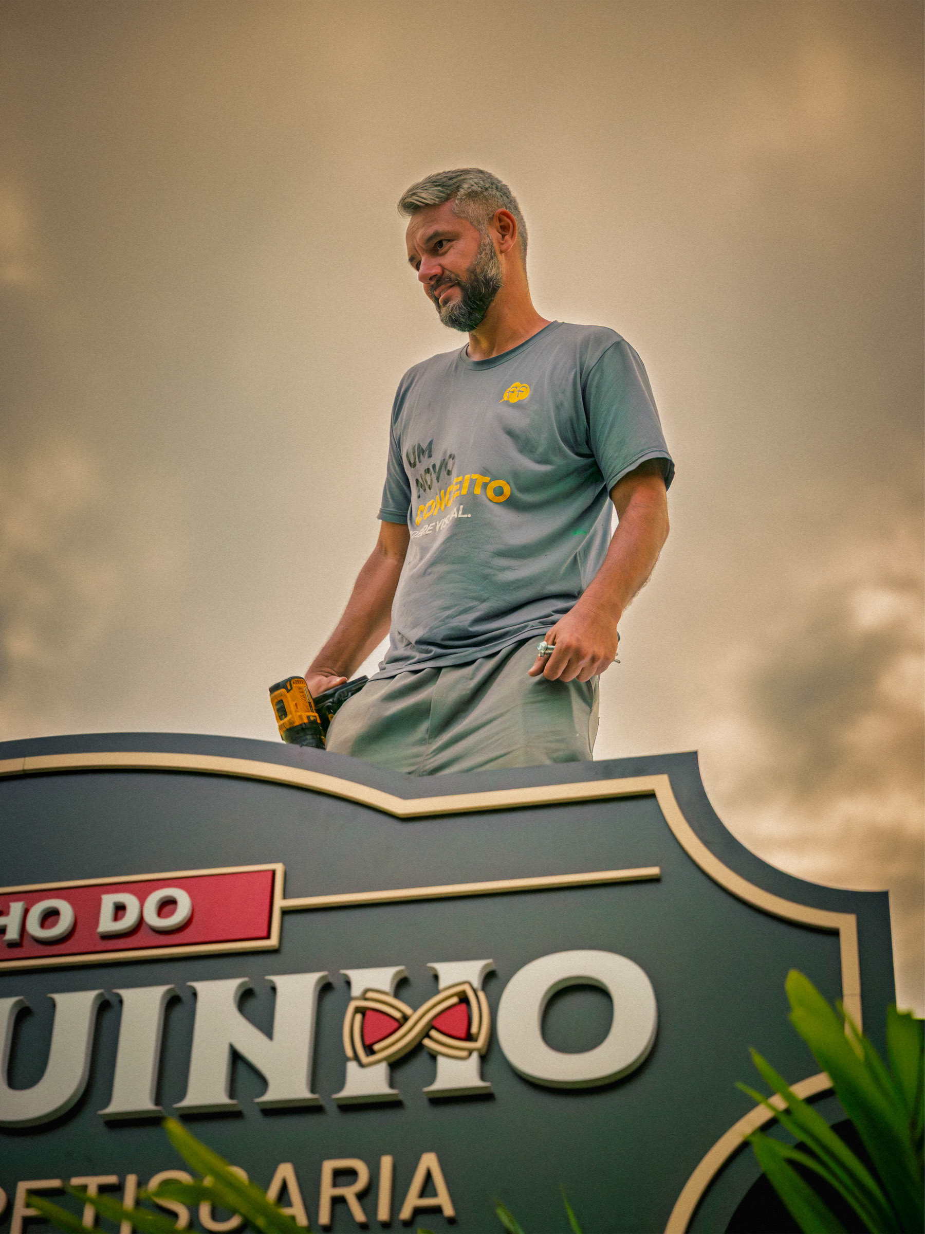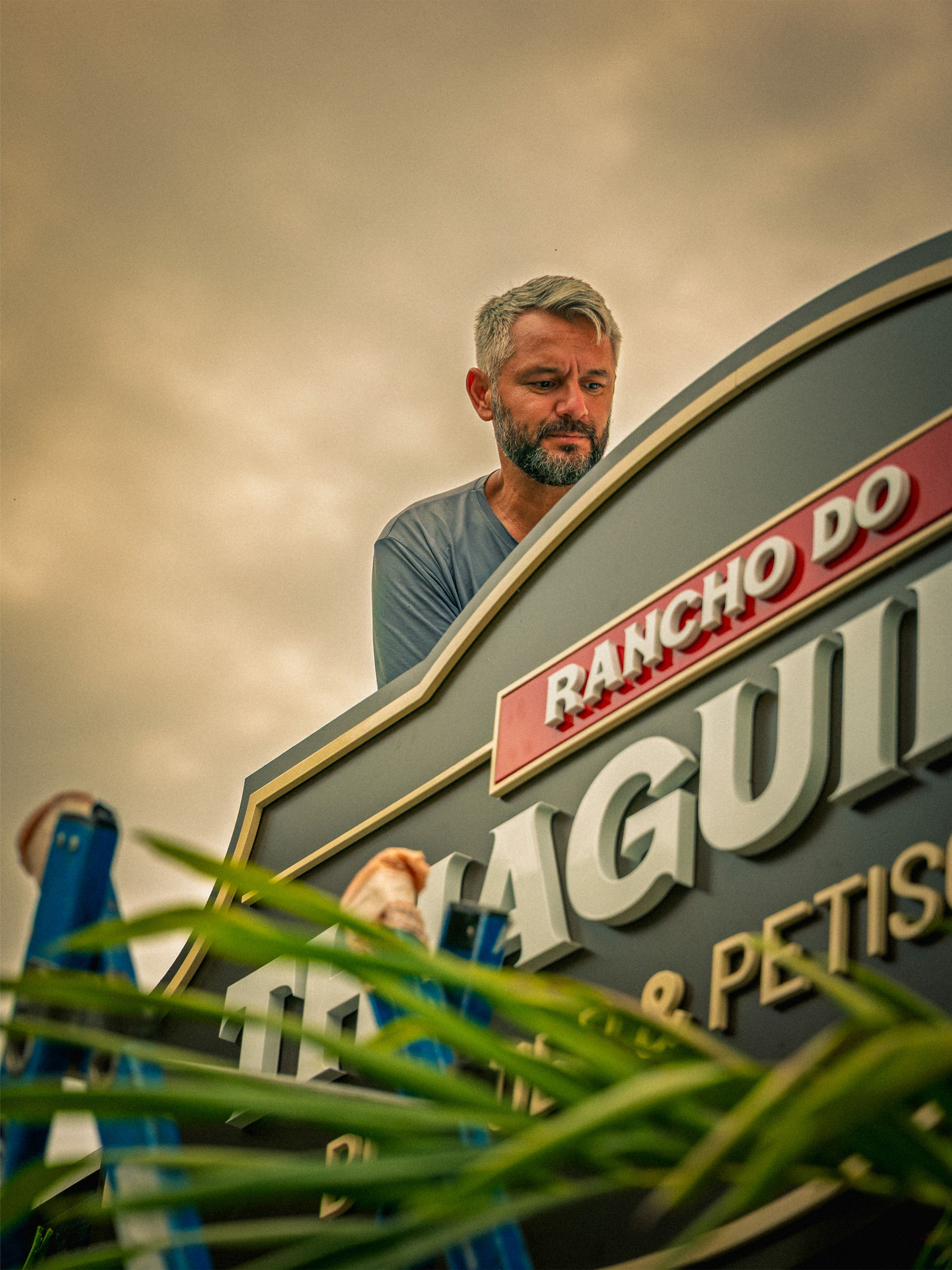 A instalação das novas placas do Rancho do Thiaguinho exigiu precisão técnica para garantir a firmeza da fixação e o alinhamento perfeito do design. Minha missão foi documentar o esforço e a técnica da equipe Piffer, transformando a instalação em uma prova visual de cuidado, foco e entrega. A fotografia capturou a instalação da placa (produzida em chapa de ACM/Metalon com letras em PVC expandido e pintura PU) em ângulos dinâmicos, utilizando as escadas como elemento gráfico. O uso da luz do golden hour realça as texturas da madeira e do tijolinho, criando uma atmosfera quente que contrasta com a seriedade da equipe Piffer. Este registro evidencia a concentração na fixação final com fita dupla face 3M, que assegura a durabilidade e o acabamento impecável. O álbum se aprofunda nos detalhes técnicos, registrando o momento em que a placa é elevada e fixada, garantindo que o design da marca se integrasse perfeitamente à arquitetura do pergolado. A atenção rigorosa ao alinhamento é a prova visual da expertise que a Piffer emprega para valorizar o visual de cada marca. As imagens criam um portfólio de cobertura operacional que reforça o compromisso da Piffer com a excelência técnica e a durabilidade, mesmo sob a pressão da instalação final.