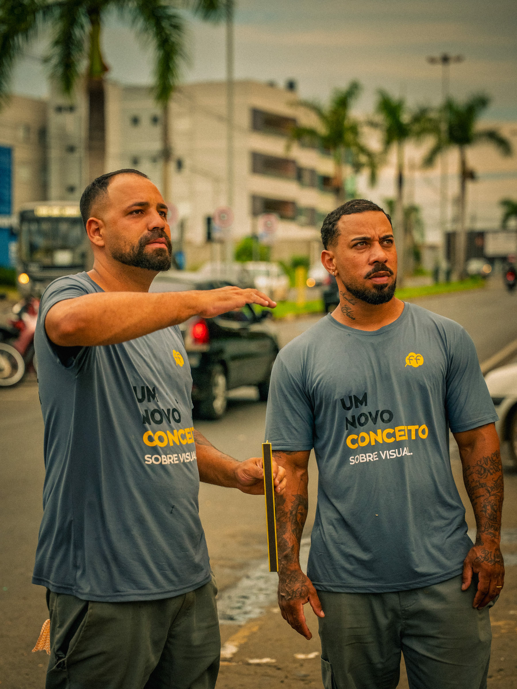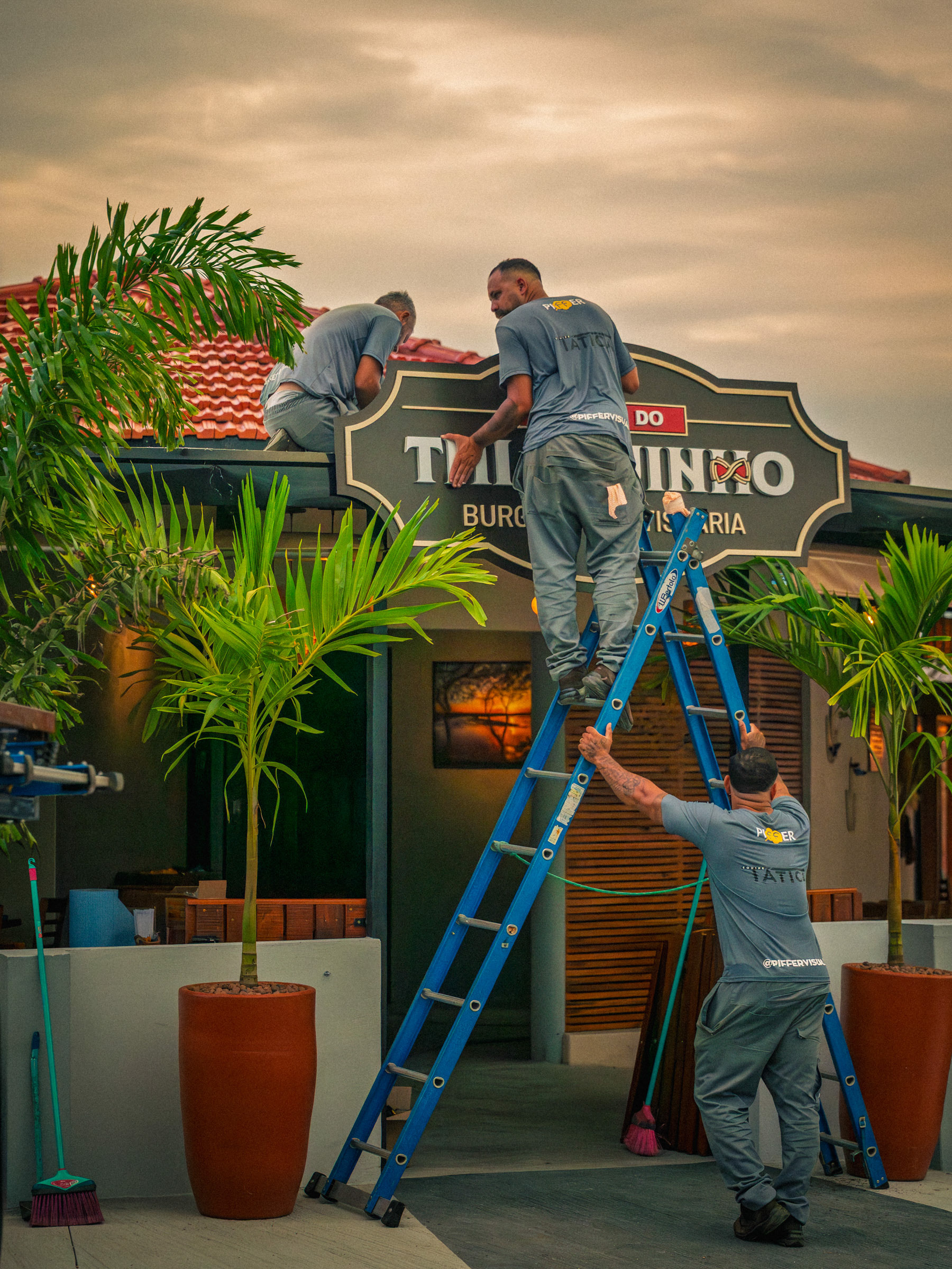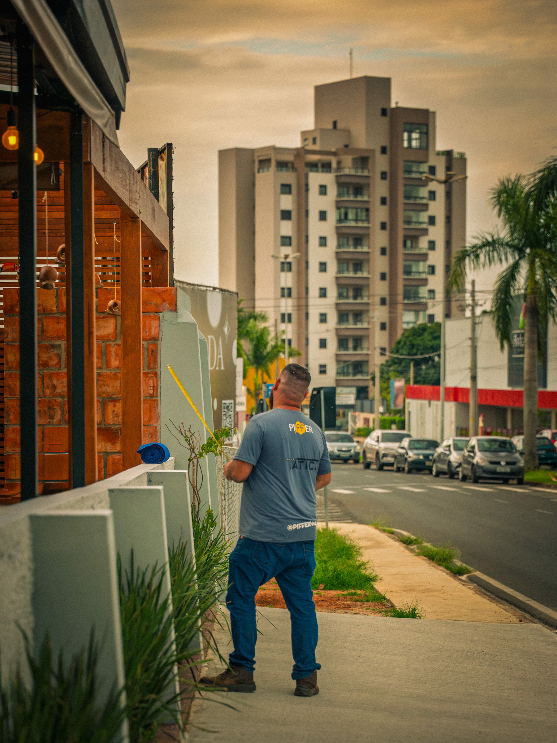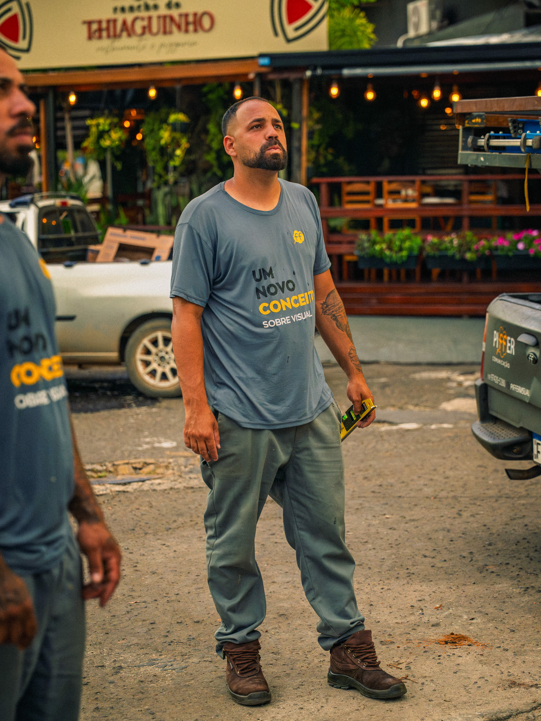 A instalação das novas placas do Rancho do Thiaguinho exigiu precisão técnica para garantir a firmeza da fixação e o alinhamento perfeito do design. Minha missão foi documentar o esforço e a técnica da equipe Piffer, transformando a instalação em uma prova visual de cuidado, foco e entrega. A fotografia capturou a instalação da placa (produzida em chapa de ACM/Metalon com letras em PVC expandido e pintura PU) em ângulos dinâmicos, utilizando as escadas como elemento gráfico. O uso da luz do golden hour realça as texturas da madeira e do tijolinho, criando uma atmosfera quente que contrasta com a seriedade da equipe Piffer. Este registro evidencia a concentração na fixação final com fita dupla face 3M, que assegura a durabilidade e o acabamento impecável. O álbum se aprofunda nos detalhes técnicos, registrando o momento em que a placa é elevada e fixada, garantindo que o design da marca se integrasse perfeitamente à arquitetura do pergolado. A atenção rigorosa ao alinhamento é a prova visual da expertise que a Piffer emprega para valorizar o visual de cada marca. As imagens criam um portfólio de cobertura operacional que reforça o compromisso da Piffer com a excelência técnica e a durabilidade, mesmo sob a pressão da instalação final.