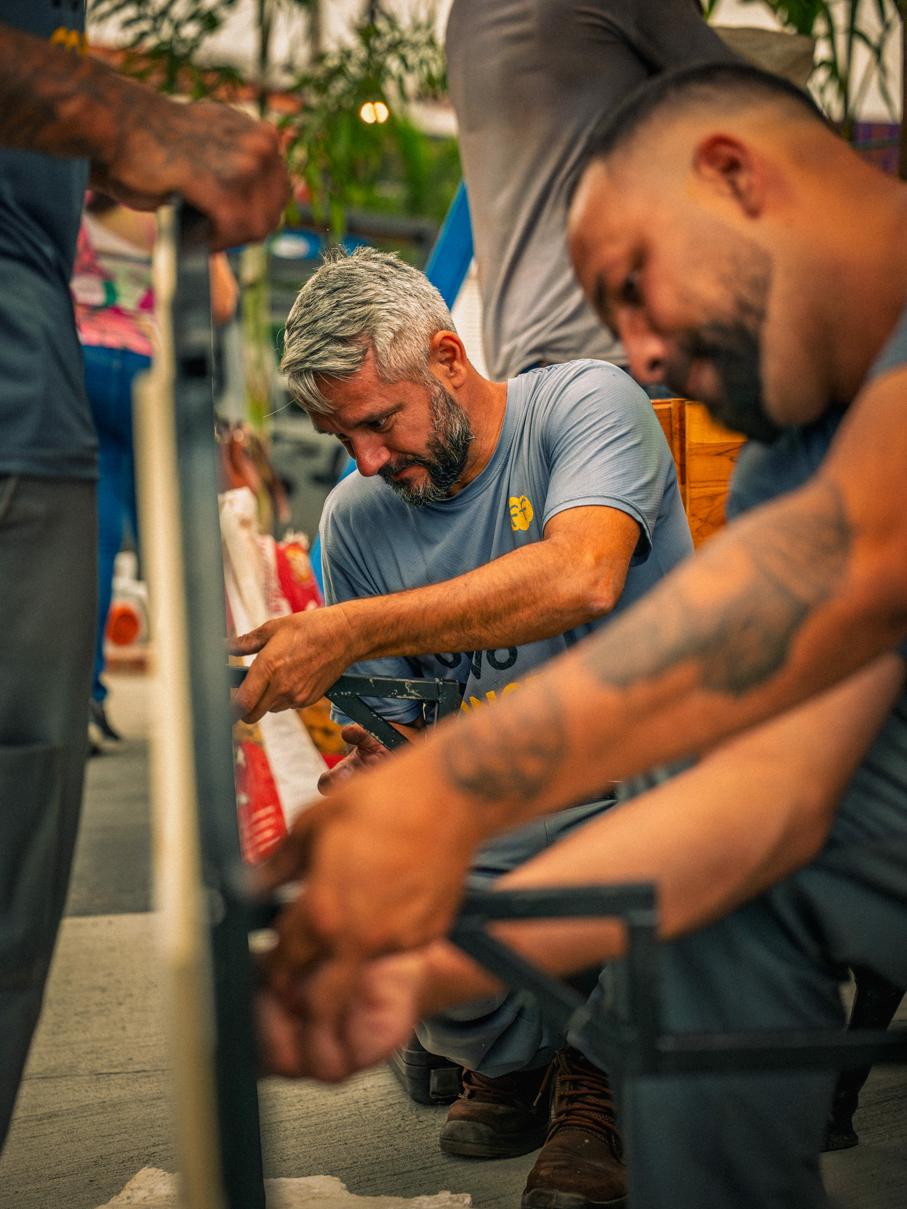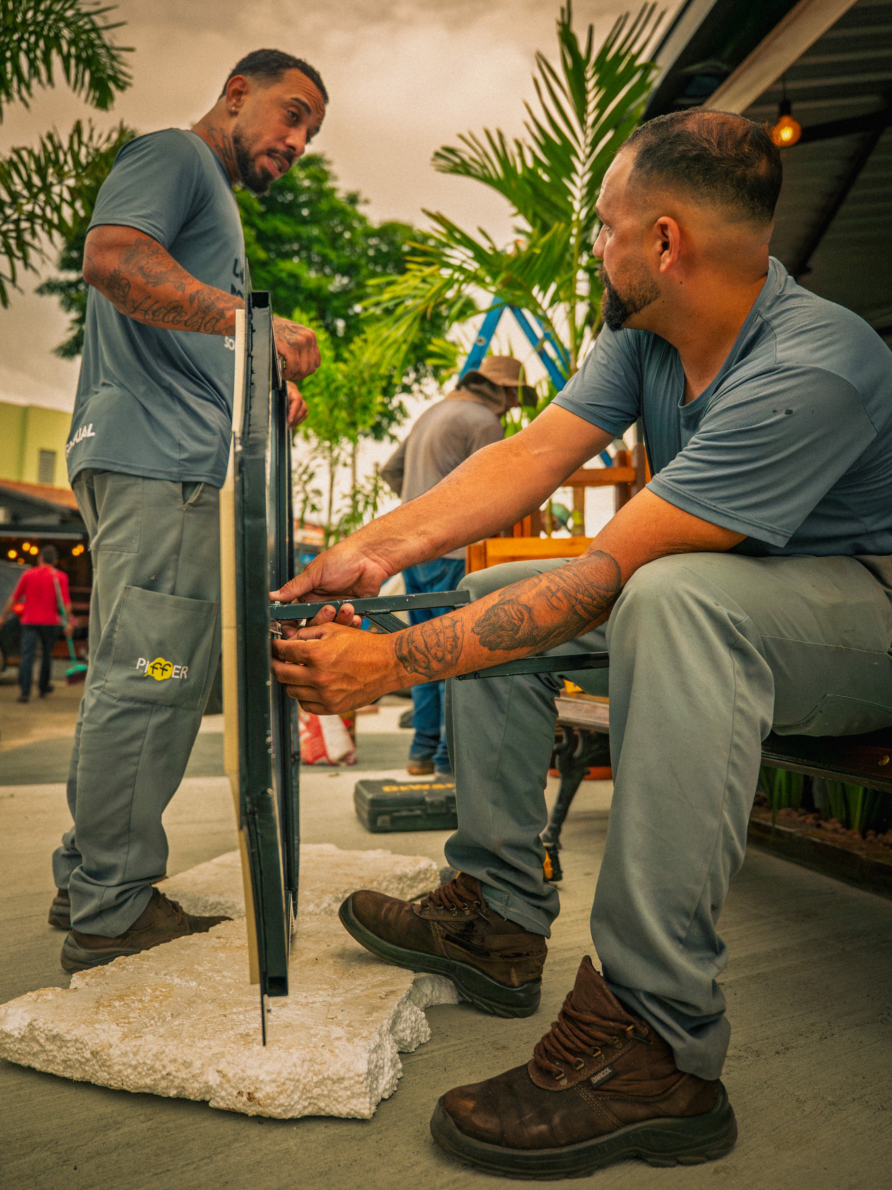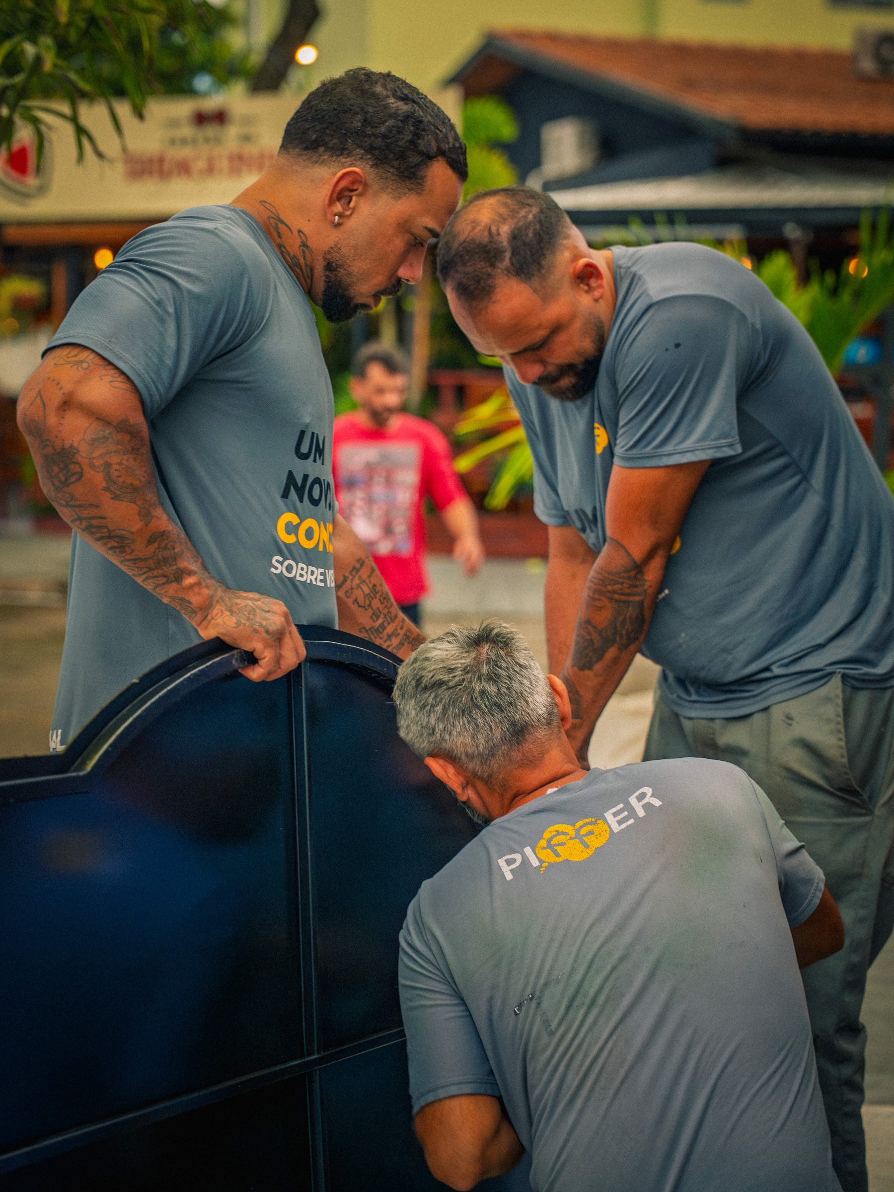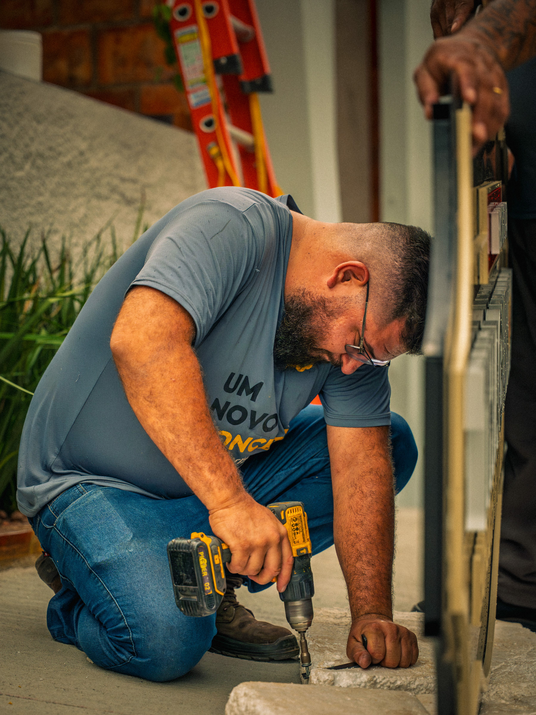 A instalação das novas placas do Rancho do Thiaguinho exigiu precisão técnica para garantir a firmeza da fixação e o alinhamento perfeito do design. Minha missão foi documentar o esforço e a técnica da equipe Piffer, transformando a instalação em uma prova visual de cuidado, foco e entrega. A fotografia capturou a instalação da placa (produzida em chapa de ACM/Metalon com letras em PVC expandido e pintura PU) em ângulos dinâmicos, utilizando as escadas como elemento gráfico. O uso da luz do golden hour realça as texturas da madeira e do tijolinho, criando uma atmosfera quente que contrasta com a seriedade da equipe Piffer. Este registro evidencia a concentração na fixação final com fita dupla face 3M, que assegura a durabilidade e o acabamento impecável. O álbum se aprofunda nos detalhes técnicos, registrando o momento em que a placa é elevada e fixada, garantindo que o design da marca se integrasse perfeitamente à arquitetura do pergolado. A atenção rigorosa ao alinhamento é a prova visual da expertise que a Piffer emprega para valorizar o visual de cada marca. As imagens criam um portfólio de cobertura operacional que reforça o compromisso da Piffer com a excelência técnica e a durabilidade, mesmo sob a pressão da instalação final.