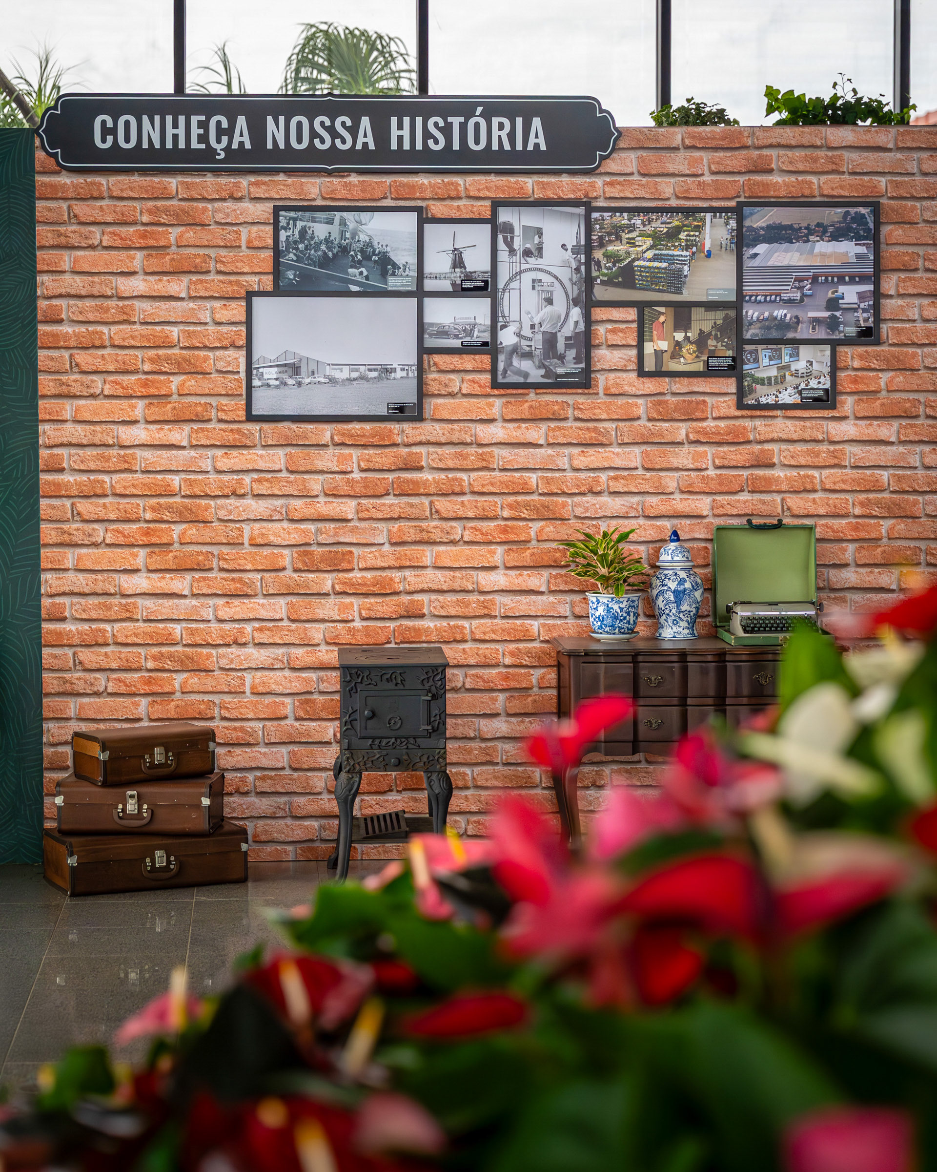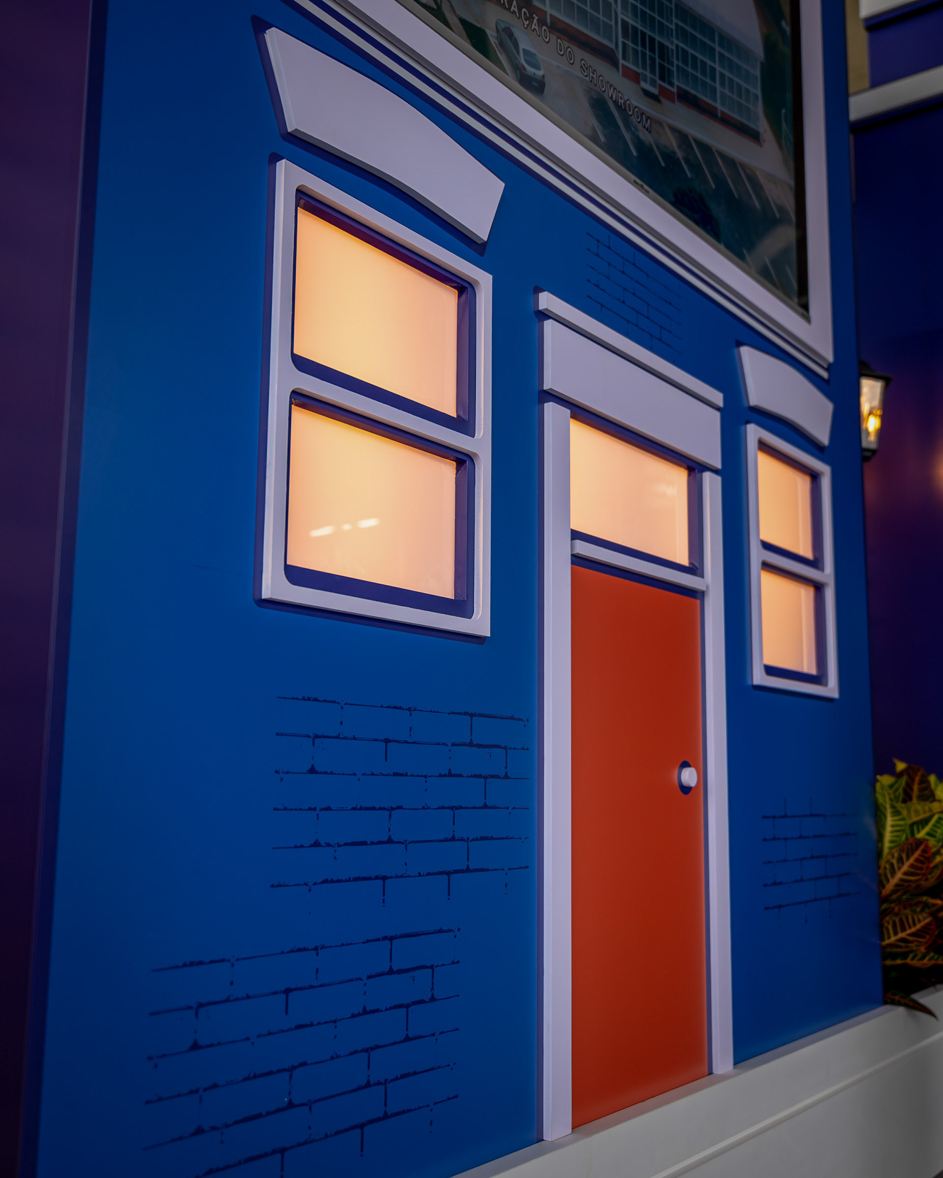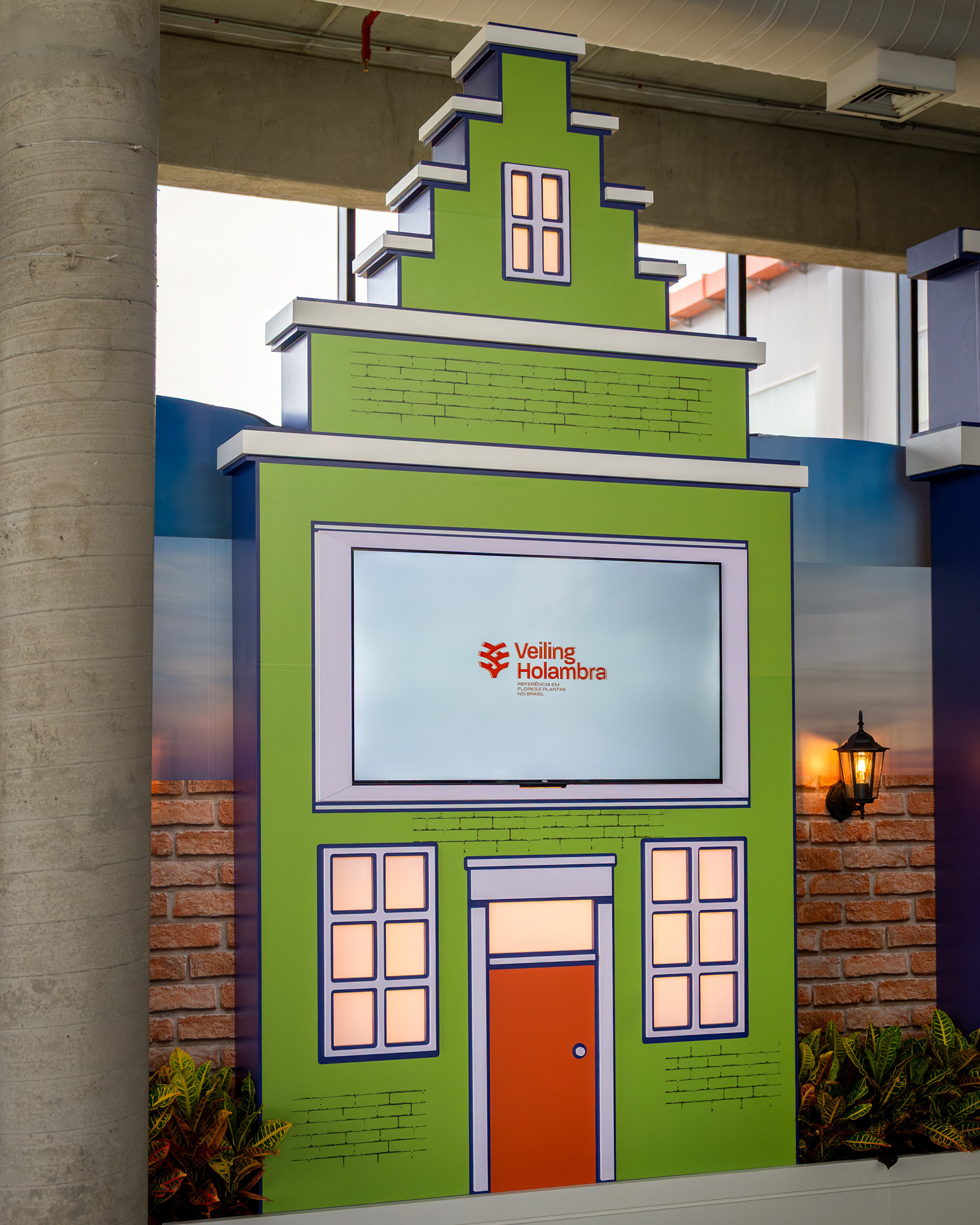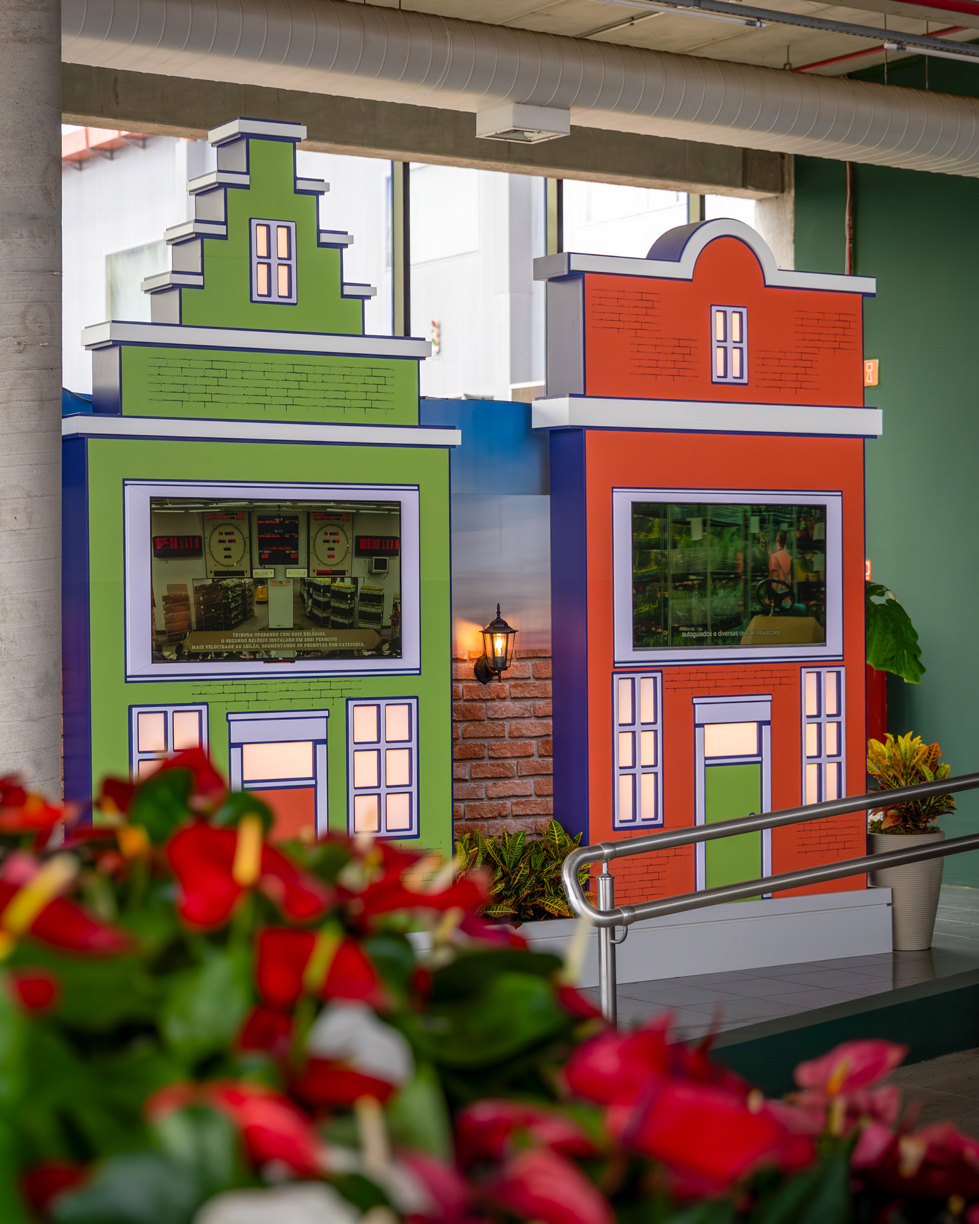 O projeto para o hall de entrada do Veiling Holambra foi um exercício de cenografia com propósito: transformar um espaço institucional com televisores em um ambiente acolhedor e narrativo, que celebrasse a história e a cultura holandesa da cooperativa. Meu trabalho foi capturar a criatividade da cenografia e a ilusão da luz que traz vida às peças. A cenografia utilizou estruturas em MDF e PVC expandido para criar fachadas inspiradas em Amsterdã. A fotografia deu foco especial à iluminação interna das janelas (policarbonato leitoso com LED), registrando o efeito acolhedor da simulação de "luzes acesas" e o contraste das cores vibrantes com o fundo industrial do hall. As composições foram pensadas para mostrar a escala das estruturas e o acabamento dos materiais, garantindo que a impressão em alta qualidade do tijolinho e das fachadas fosse registrada com fidelidade. Além das fachadas, a documentação se concentrou em como o ambiente conta a história. O painel com quadros históricos, instalado sobre a parede cenográfica de tijolinho, foi registrado em close-ups que valorizam a aplicação do adesivo fosco nas bases de MDF. A inclusão estratégica de elementos de primeiro plano (flores e o elemento decorativo da folha) reforçou a temática do Veiling, transformando o registro em uma experiência visual repleta de significado. As imagens atestam o poder da cenografia feita com propósito, registrando a transformação de um espaço funcional em uma experiência visual imersiva e autêntica, perfeitamente alinhada à história da marca.
