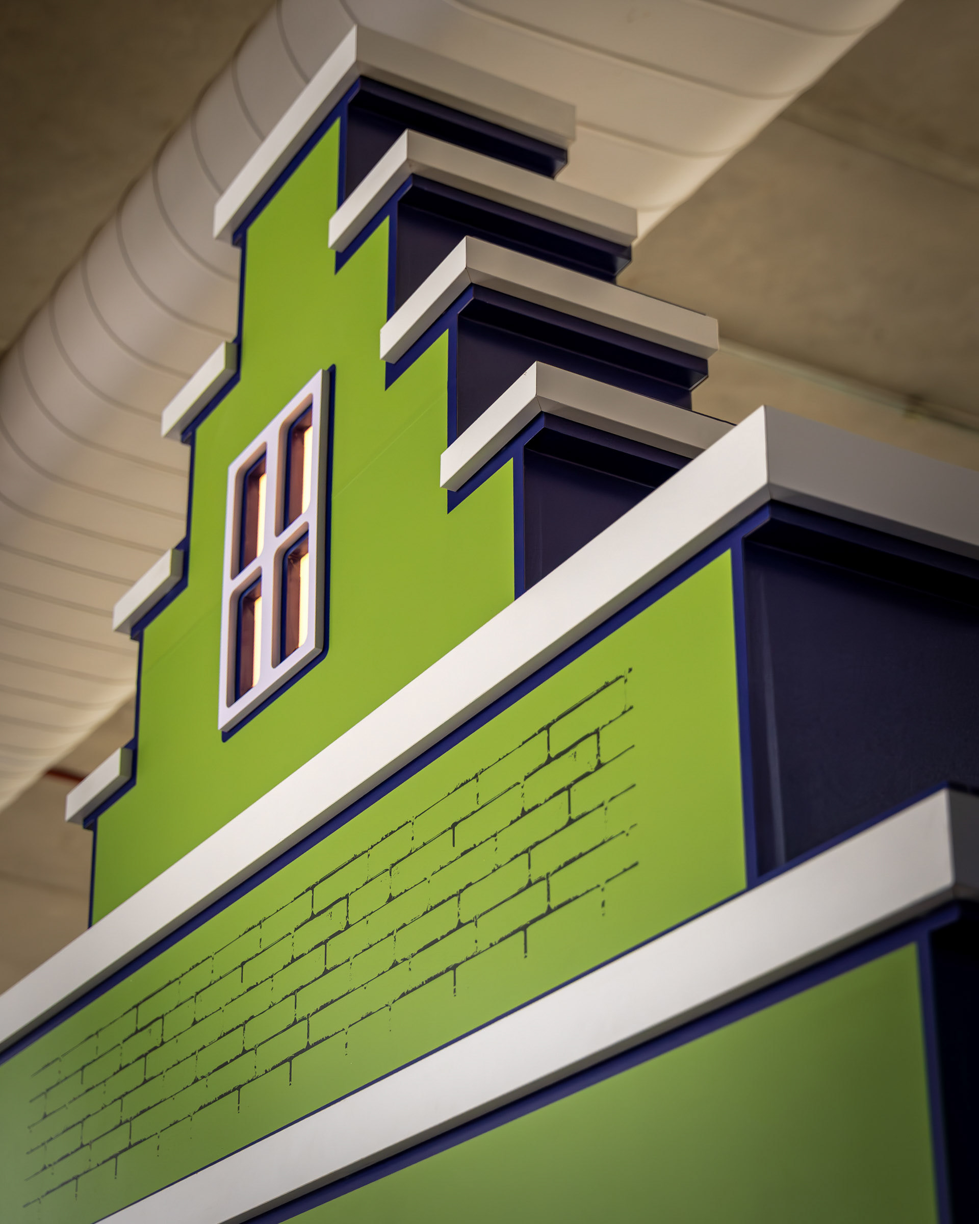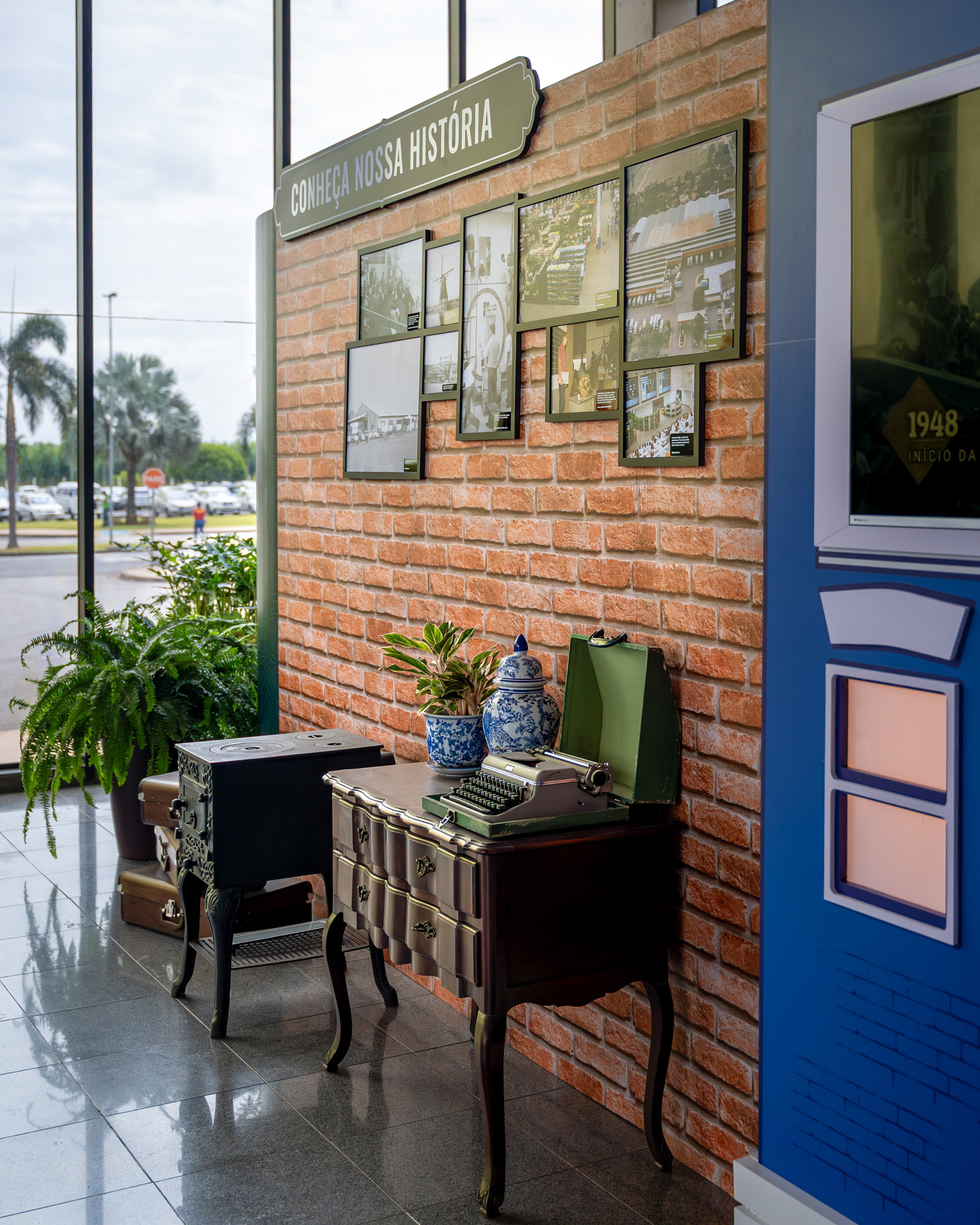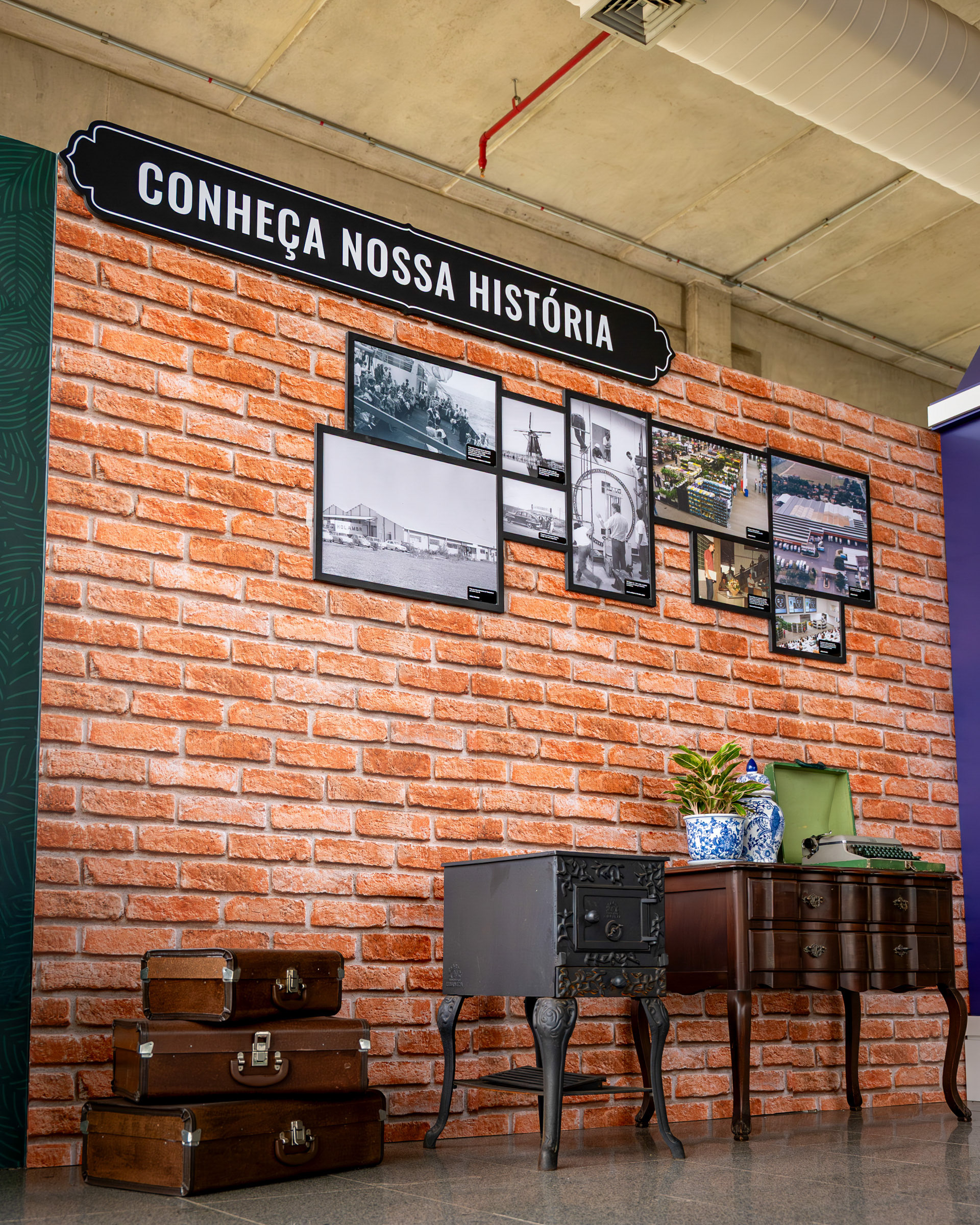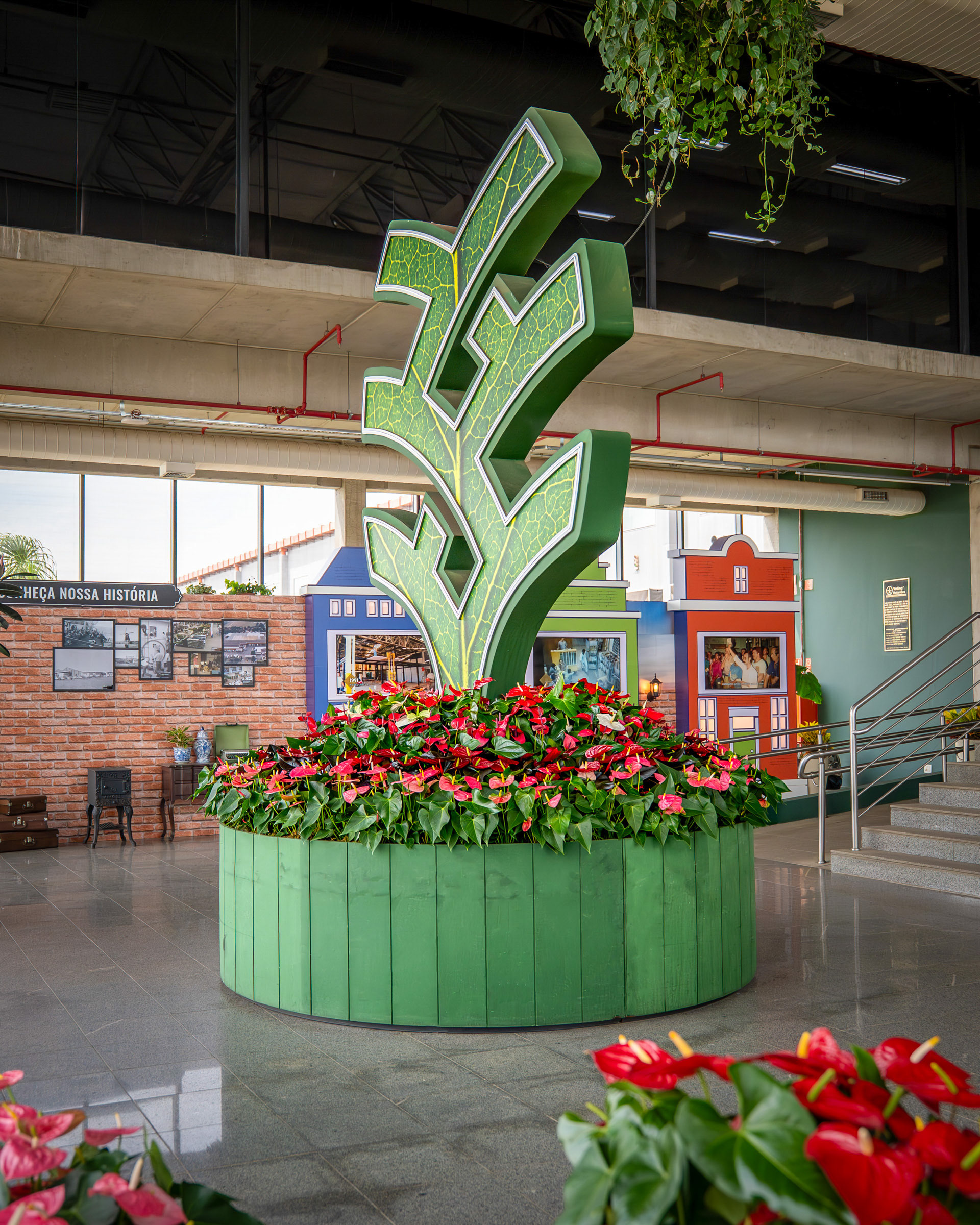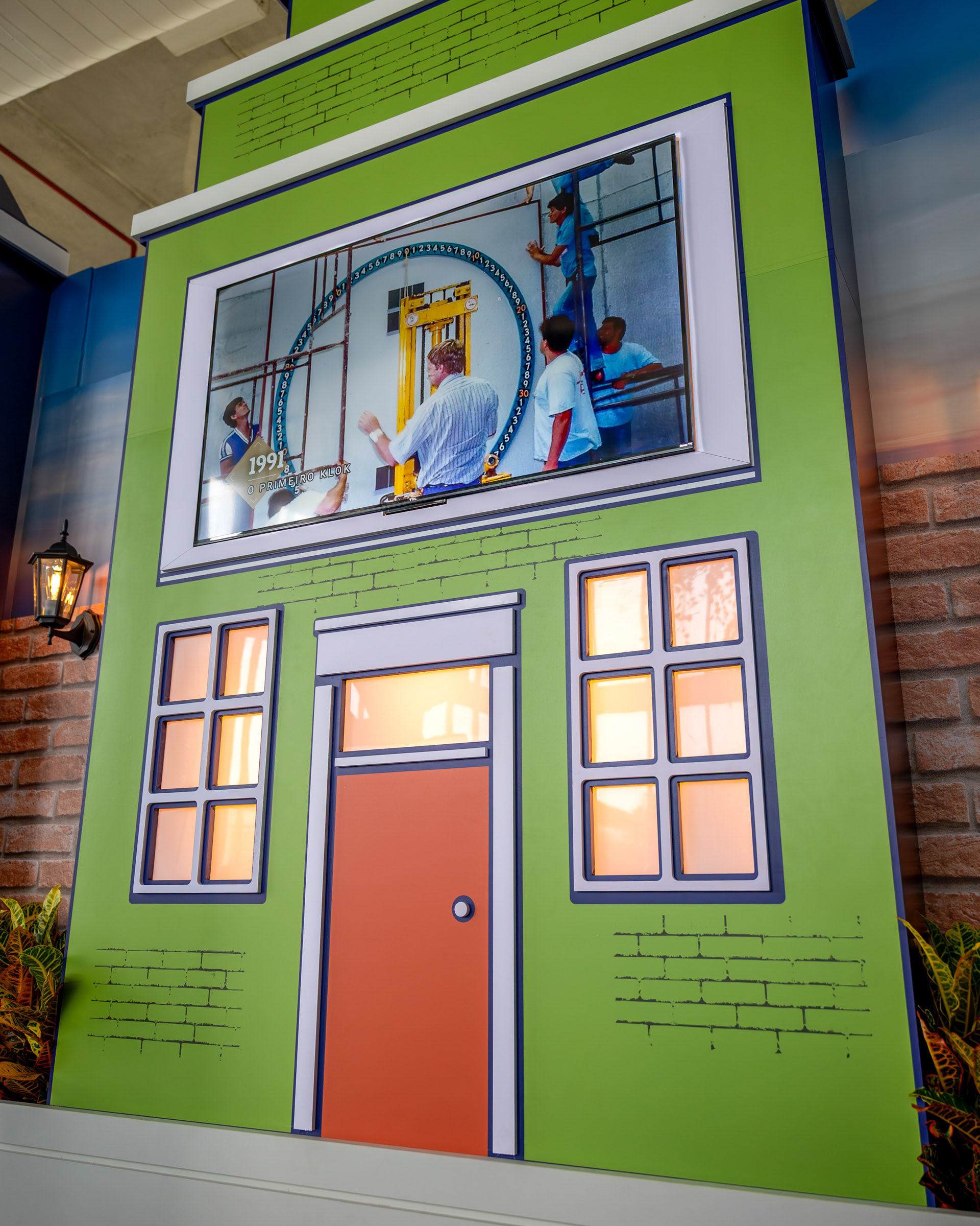 O projeto para o hall de entrada do Veiling Holambra foi um exercício de cenografia com propósito: transformar um espaço institucional com televisores em um ambiente acolhedor e narrativo, que celebrasse a história e a cultura holandesa da cooperativa. Meu trabalho foi capturar a criatividade da cenografia e a ilusão da luz que traz vida às peças. A cenografia utilizou estruturas em MDF e PVC expandido para criar fachadas inspiradas em Amsterdã. A fotografia deu foco especial à iluminação interna das janelas (policarbonato leitoso com LED), registrando o efeito acolhedor da simulação de "luzes acesas" e o contraste das cores vibrantes com o fundo industrial do hall. As composições foram pensadas para mostrar a escala das estruturas e o acabamento dos materiais, garantindo que a impressão em alta qualidade do tijolinho e das fachadas fosse registrada com fidelidade. Além das fachadas, a documentação se concentrou em como o ambiente conta a história. O painel com quadros históricos, instalado sobre a parede cenográfica de tijolinho, foi registrado em close-ups que valorizam a aplicação do adesivo fosco nas bases de MDF. A inclusão estratégica de elementos de primeiro plano (flores e o elemento decorativo da folha) reforçou a temática do Veiling, transformando o registro em uma experiência visual repleta de significado. As imagens atestam o poder da cenografia feita com propósito, registrando a transformação de um espaço funcional em uma experiência visual imersiva e autêntica, perfeitamente alinhada à história da marca.